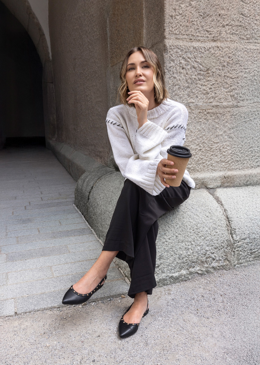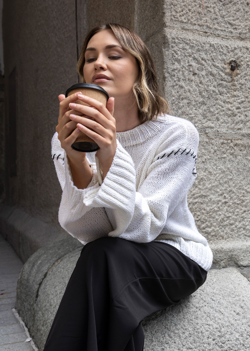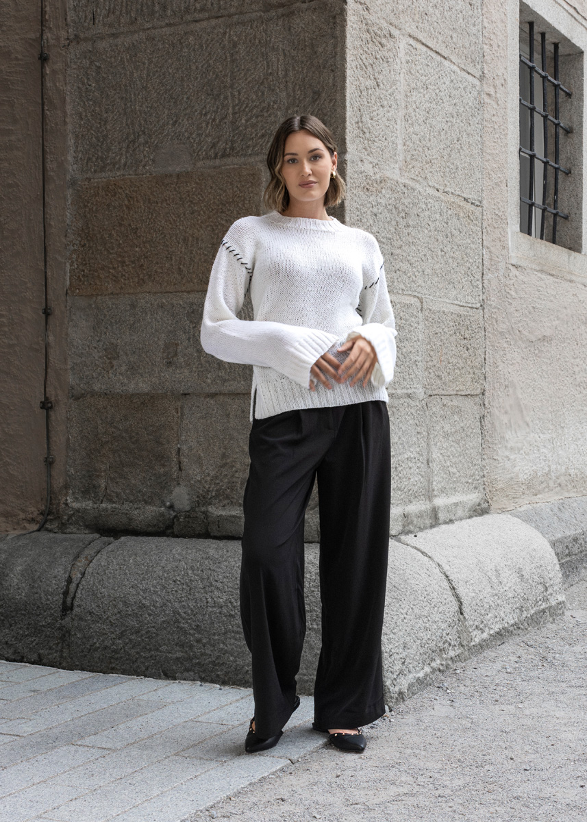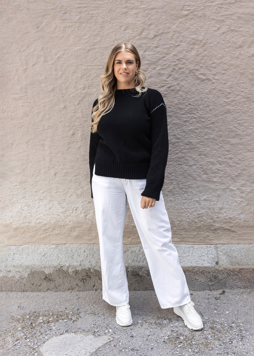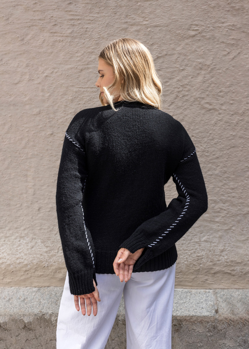 Lana Grossa MERINO UNO 100 % ren ny ull merino Løpelengde: ca. 125 m / 50 g • 350 (350 - 400 - 400 - 450 - 450) g hvit (farge 1) eller svart (farge 13 • 50 g svart (farge 13) eller hvit (farge 1) • Strikkepinner nr. 3,5 og 5 • Rundpinne nr. 3,5 / 40 cm • Ullnål