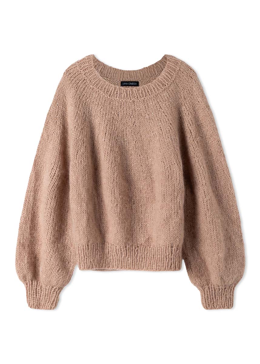 Lana Grossa Mohair di Gio (55% mohair (superkid), 45% ren ny ull (merino superfin), løpelengde = ca. 85 m/50 g), 500 (550 - 600) g i beige (farge 8) og Lana Grossa Glamour (55% polyacryl, 45% polyester, løpelengde = ca. 112 m/50 g), 25 g i beige (farge 10); 60 cm og 100 cm lange rundpinner og settpinner nr. 7; 50 cm, 80 cm, 100 cm og 120 cm lange rundpinne nr. 8; 4 maskemarkører (MM); 2 hjelpepinne til hvilende m