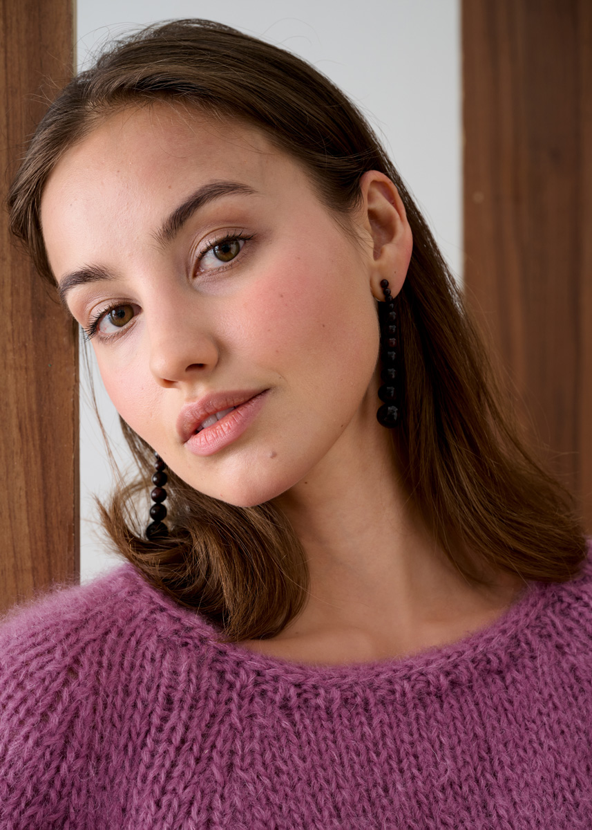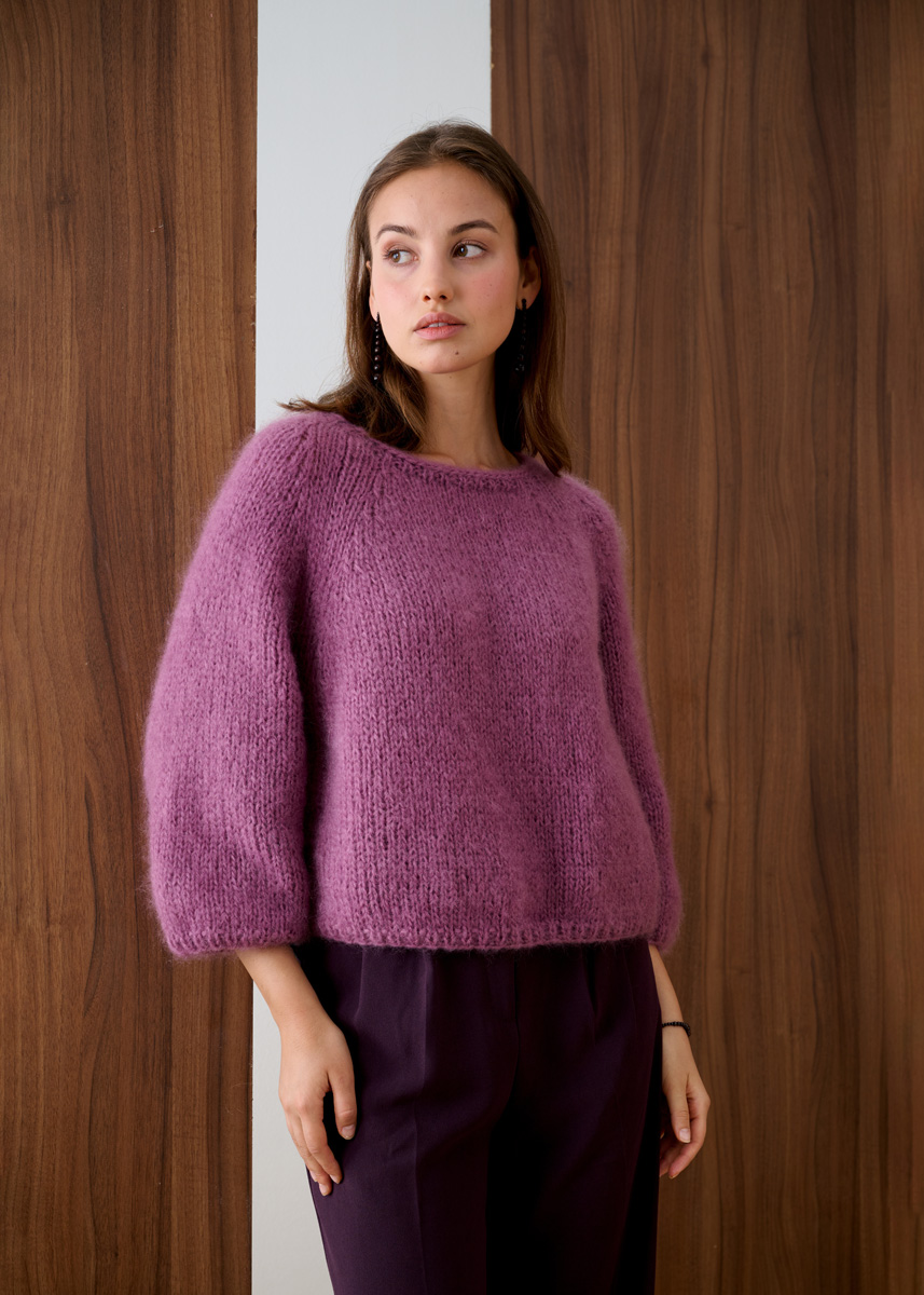 Lana Grossa Mohair di Gio (55% mohair (super-kid), 45% ren ny (merino extrafine), LL 85 m/50 g), 400 (450 – 500 – 550) g mauve (frg 4). Pinner: Nr. 7 og rundpinne nr. 7, 40 cm lang.