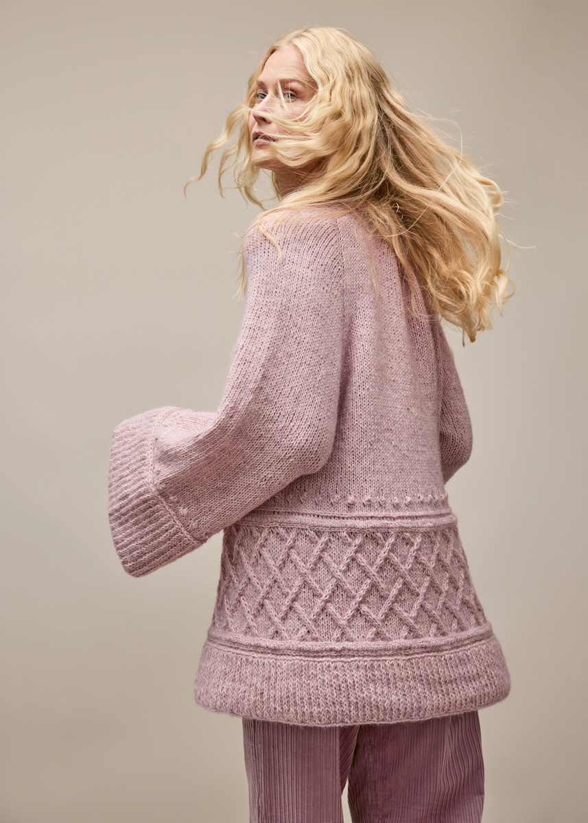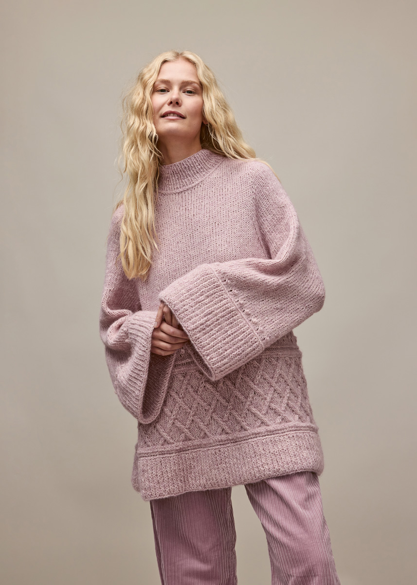 Garn: Lana Grossa Natural Alpaca Pelo (63 % bomull, 31 % alpakka (baby), 6 % ren ny ull (merino), LL = 125 m/50 g): 600 g rosa melert (frg 15). Pinner: Rundpinne 4 og 5 mm, 80–100 cm lang (strikk omg med liten omkrets enten med teknikken magic loop eller på kortere rundpinne 4 og 5 mm), flettepinne. Tilbehør: 4 maskemarkører.