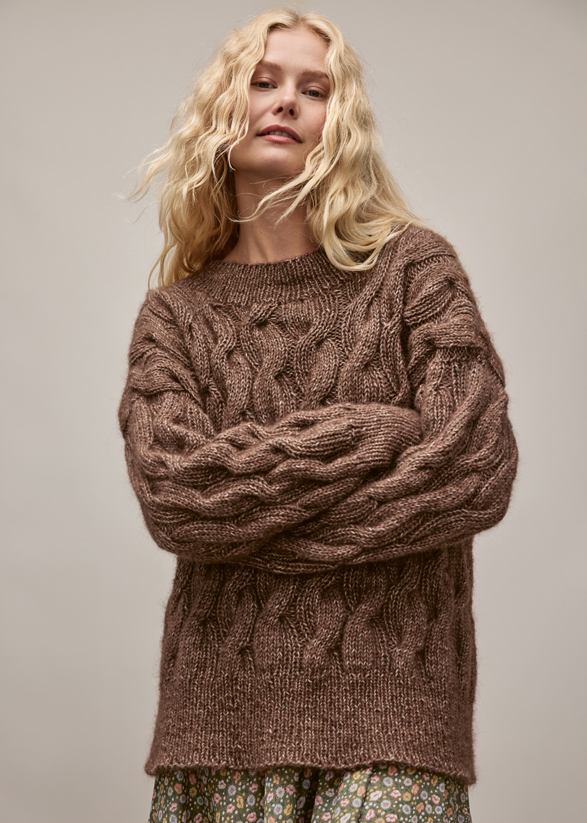 Garn: Lana Grossa Natural Alpaca Pelo (63 % bomull, 31 % alpakka, 6 % ren ny ull (merino), LL = 125 m / 50 g): 550 (600 / 650 / 700) g mørk brun melert (frg 8) og Lana Grossa Natural Superkid Tweed (60 % mohair (superkid), 30 % silke, 7 % bomull, 3 % polyester, LL = 200 m/25 g): 175 (175 / 200 / 225) g nougat (frg 637). Pinner: Rundpinne 4 og 6 mm, 80–100 cm lang (strikk omg med liten omkrets enten med teknikken magic loop eller med en ekstra kort rundpinne 4 og 6 mm), flettepinne.