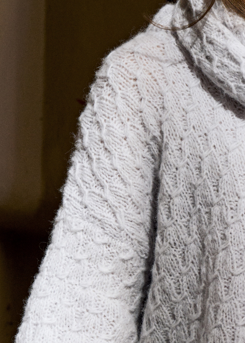 Garn: Lana Grossa «Nebbia» (55 % ren ull (merino extrafine), 45 % alpakka (baby), LL = ca. 170 m/50 g): 350 (350 - 400 - 400) g hvitgrå (frg 8).