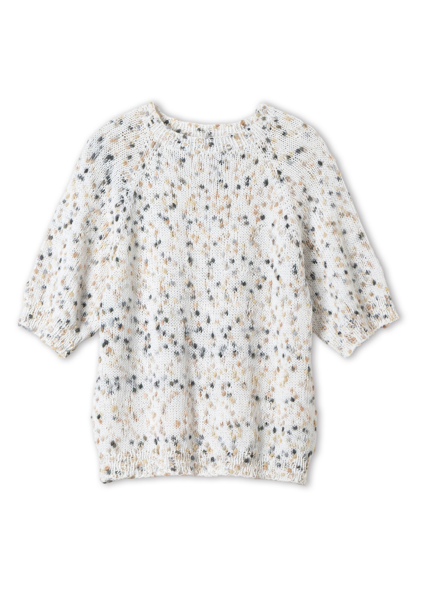 Lana Grossa-kvalitet „Popcorn“ (100 % bomull, løpelengde = ca 125 m/50 g): ca 300 (350 - 400 - 450) g hvit/beige/kamel/grå/anthrasitt (farge 9); kort og lange rundpinne nr. 4,5 og nr. 5; strømpepinner nr. 4,5 og nr. 5; maskemarkører. Genseren strikkes ovenfra og ned i ett stykke.