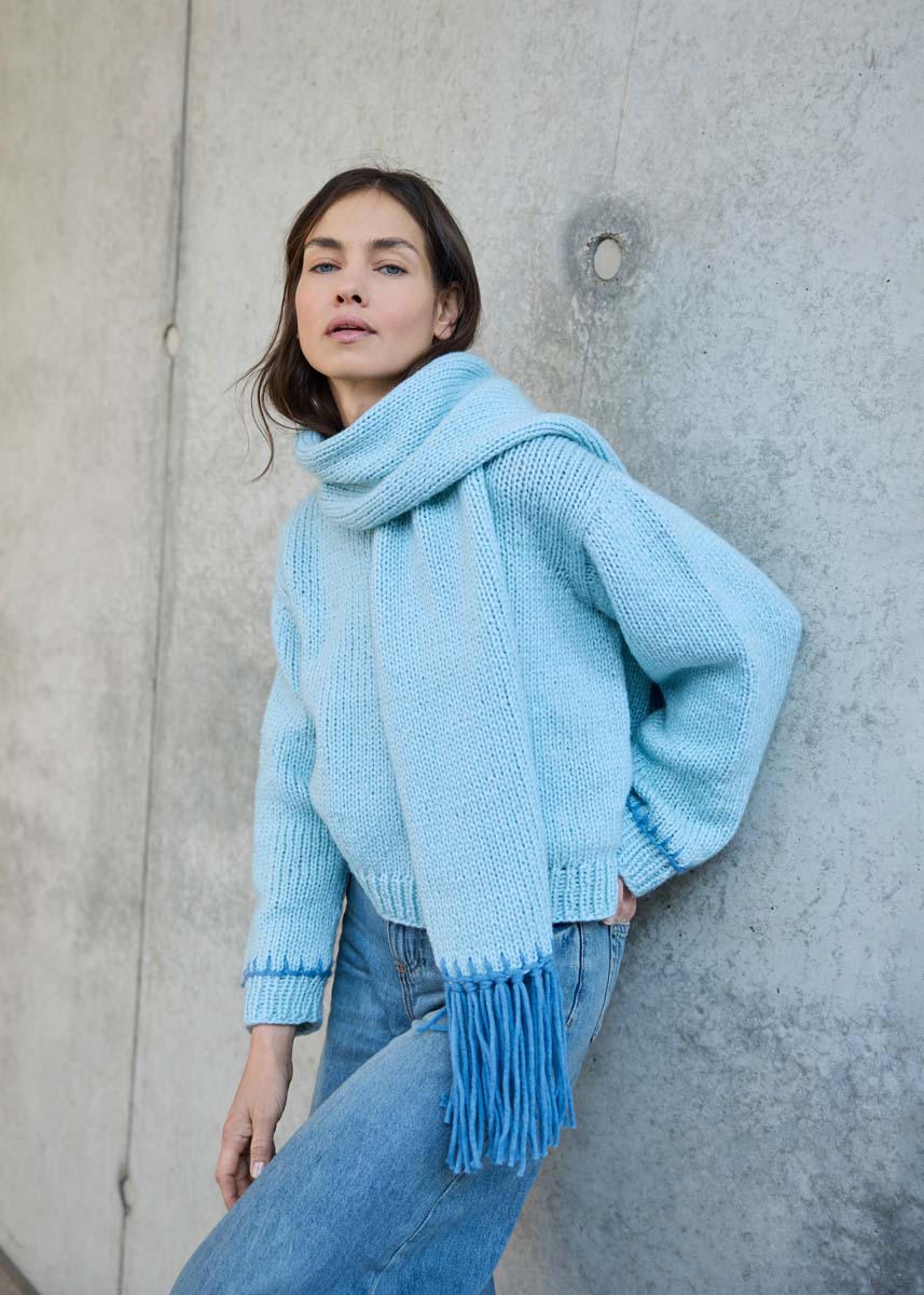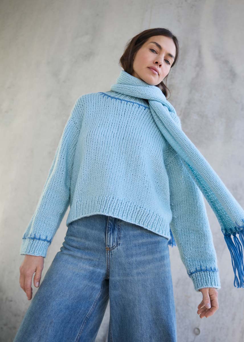Lana Grossa-kvalitet „Winter Softness“ (62 % ren ny ull (merino extrafine), 38 % bomull (bio), løpelengde = ca 70 m/50 g): 500 (550 - 600 - 650) g mintblå (farge 2) og 50 g dueblå (farge 7); kort og lang rundpinne nr. 6 og 7; strømpepinner nr. 6; 1 heklenål nr. 7; 1 butt stoppenål. Genseren strikkes ovenfra og ned i ett stykke.