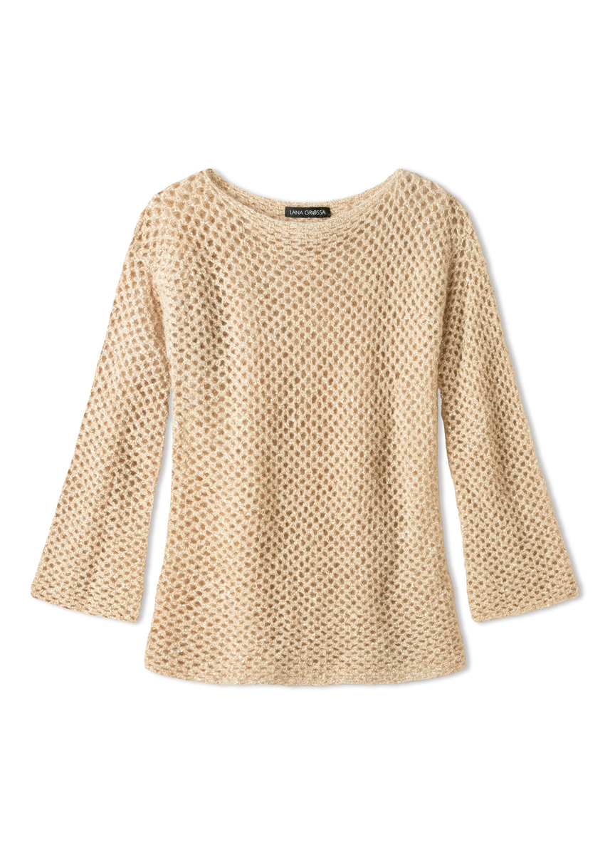 Material: Garn: Lana Grossa «Setasuri» (69 % alpakka (suri), 31 % silke, LL = ca. 212 m/25 g): Ca. 150 (150 - 175 - 175) g lys beige (frg 58); Lana Grossa «Glamour» (55 % polyamid, 45 % polyester, LL = ca. 115 m/25 g): Ca. 250 (275 - 300 - 325) g beige (frg 10) Heklenål: Nr. 4