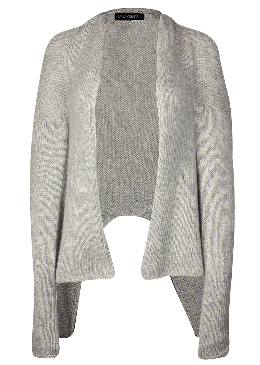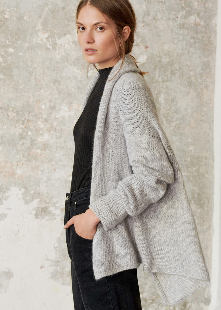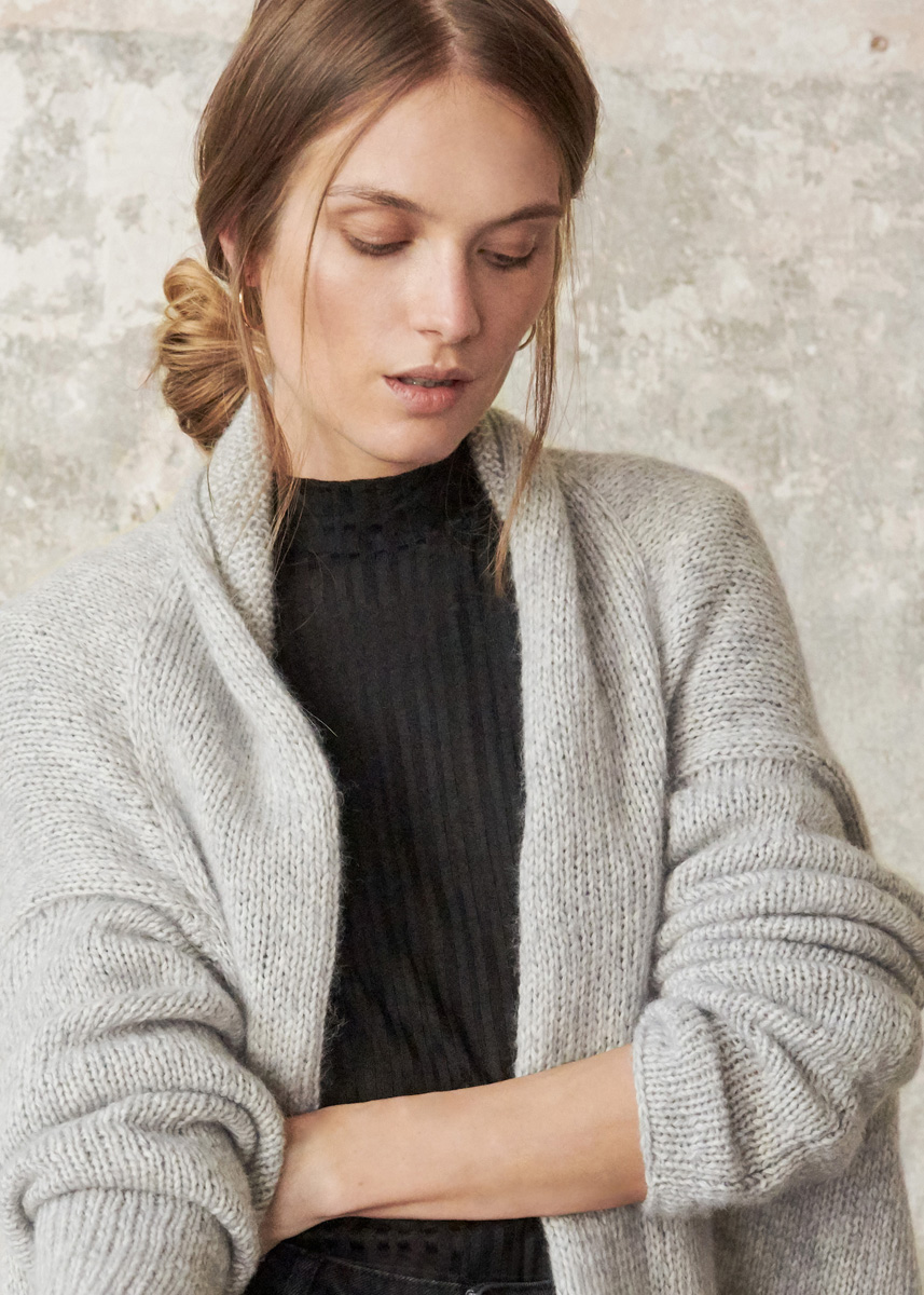 Lana Grossa-kvalitet „Brigitte No. 2” (47 % (baby) alpakka, 45 % bomull, 8 % ren ny ull (merino), løpelengde = ca. 140 m/50 g): ca. 450 (500) g sølvgrå (farge 13); 2 rundpinner nr. 6,5, 80 cm lange.