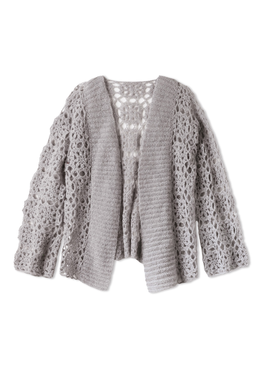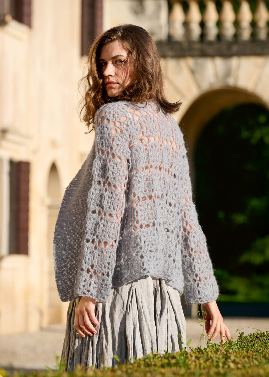 Garn: Lana Grossa «Setasuri» (69 % alpakka (suri), 31 % silke, LL = ca. 212 m/25 g): Ca. 175 (275) g lys grå (frg 19) Heklenål: Nr. 3 og 3,5.