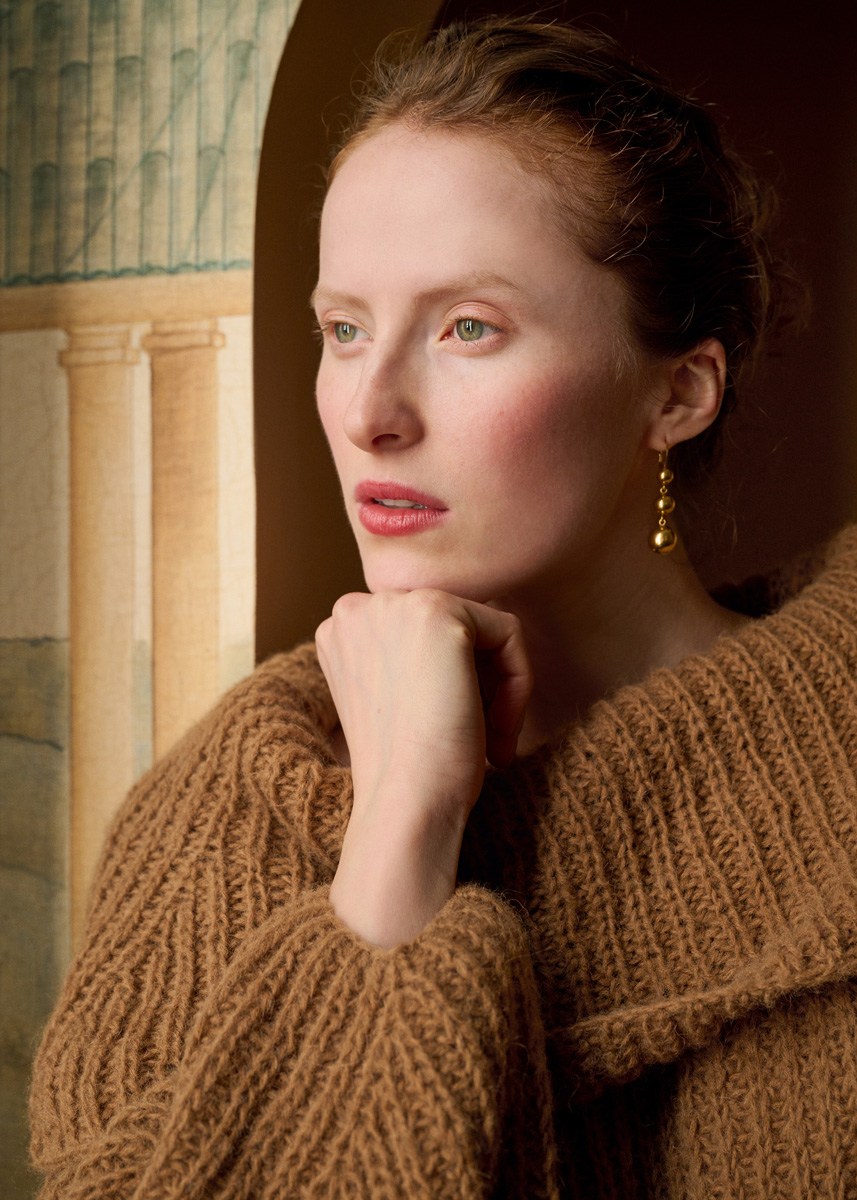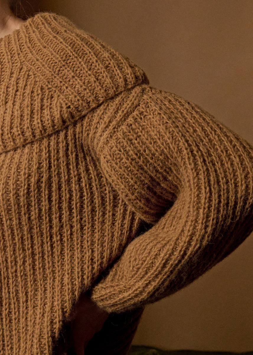 Garn: Lana Grossa «Nebbia» (55 % ren ull (merino extrafine), 45 % alpakka (baby), LL = ca. 170 m/50 g): 400 (450 - 450 - 500) g kamel (frg 12). Pinner: Nr. 5,5 og 6, kort rundp nr. 6.