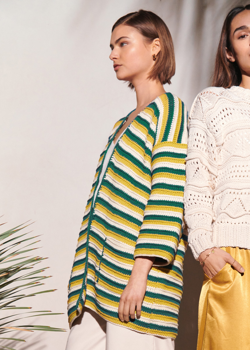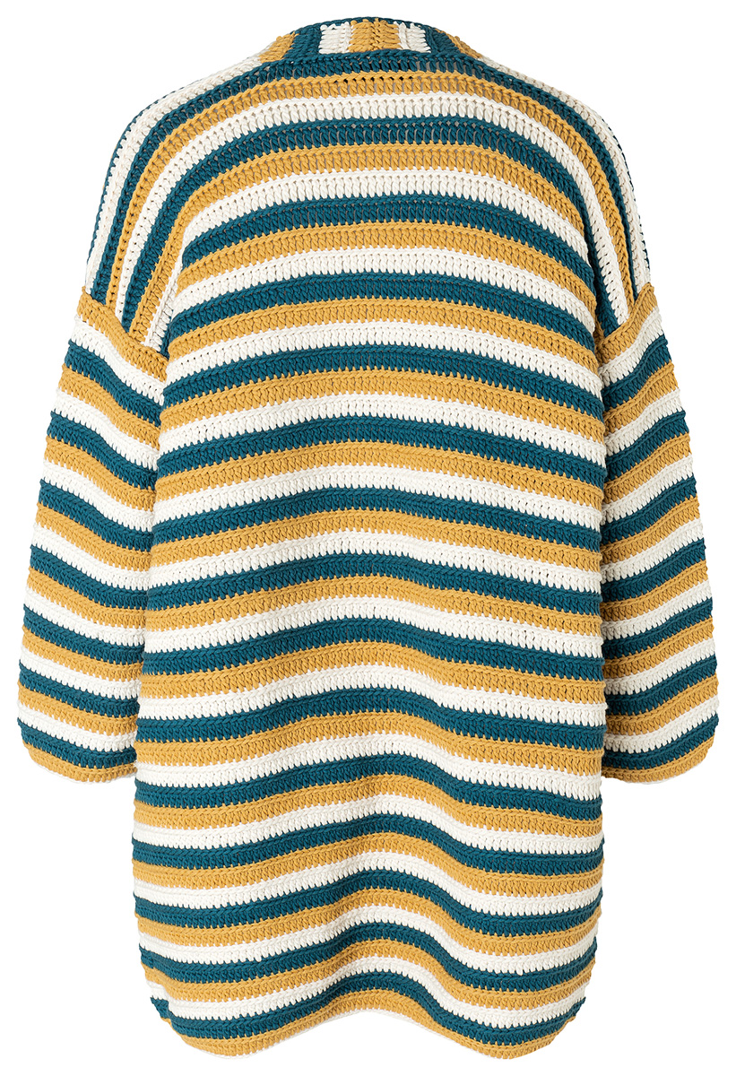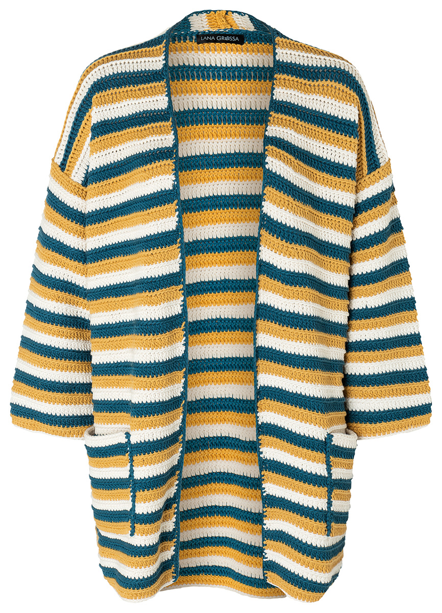 Lana Grossa-kvalitet „Riserva” (70 % (bio) bomull, 30 % återvunnen polyamid, löplängd = ca. 125 m/50 g): je ca. 300 g ecru (färg 2), petrol (färg 7) och gul (färg 17); 1 ullvirknål nr. 5.