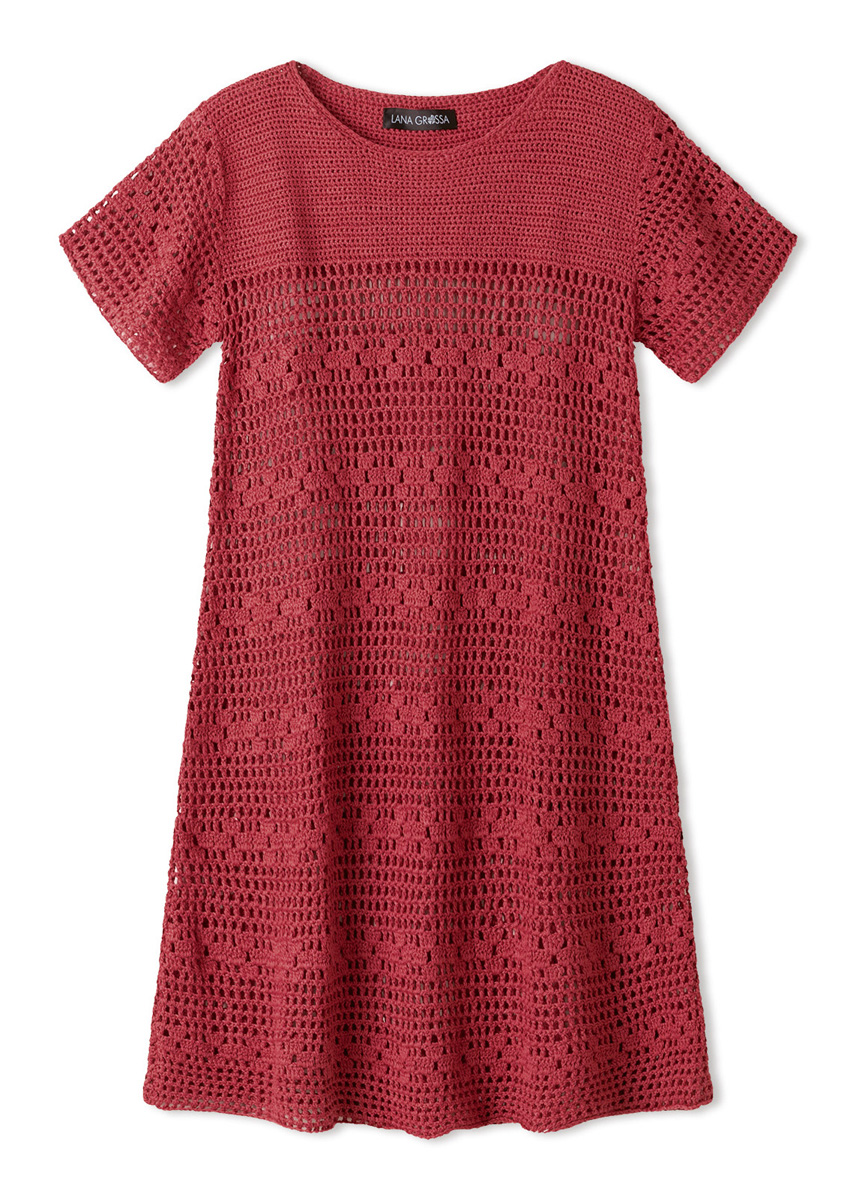 Garn: Lana Grossa «Summer Cashmere» (90 % bomull, 10 % kashmir, LL = ca. 210 m/50 g): Ca. 350 (400 - 450 - 500) g orientrød (frg 25) Heklenål: Nr. 3 og nr. 3,5