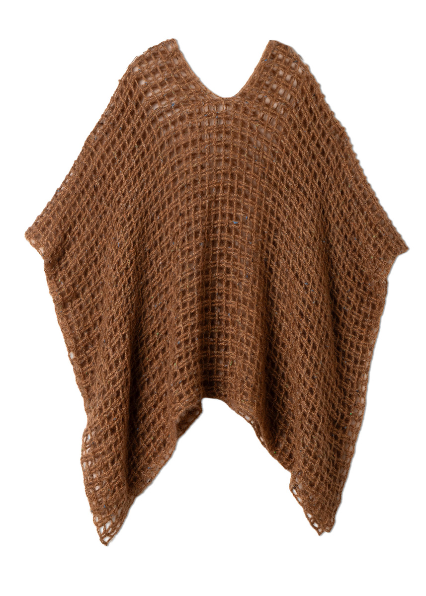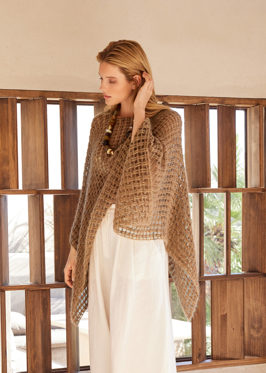 Lana Grossa Natural Superkid Tweed (60% mohair, (Superkid), 30% silke, 7% bomull, 3% polyester, løpelengde = ca. 200 m/25 g), 275 (350) g i kamel (farge 620). 1 heklenål nr. 4,5.