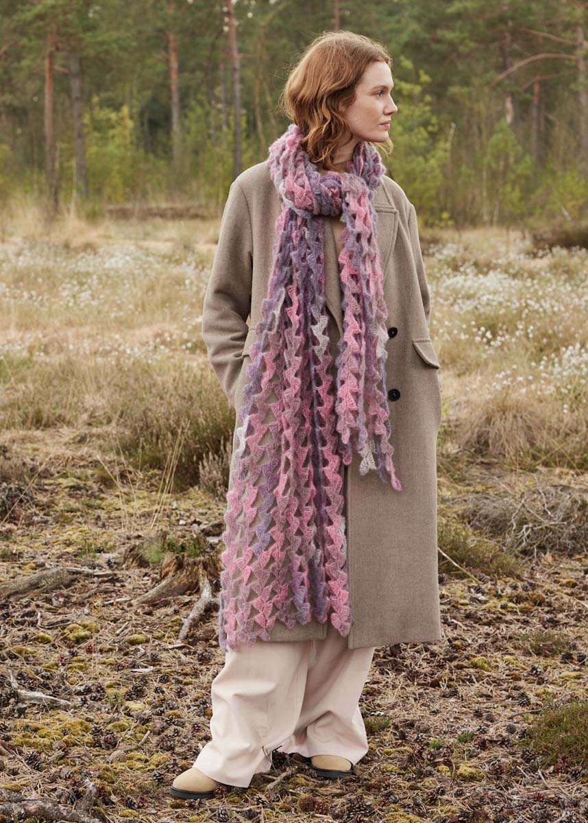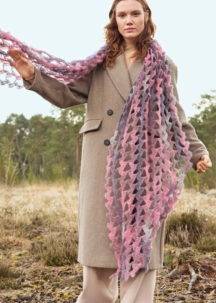 Lana Grossa Silkhair Print (70% mohair (superkid), 30% silke, løpelengde 210 m/25 g), 175 g i pink/bordeaux/lysgrå/gråfiolett (farge 435); 1 heklenål nr. 4,5.