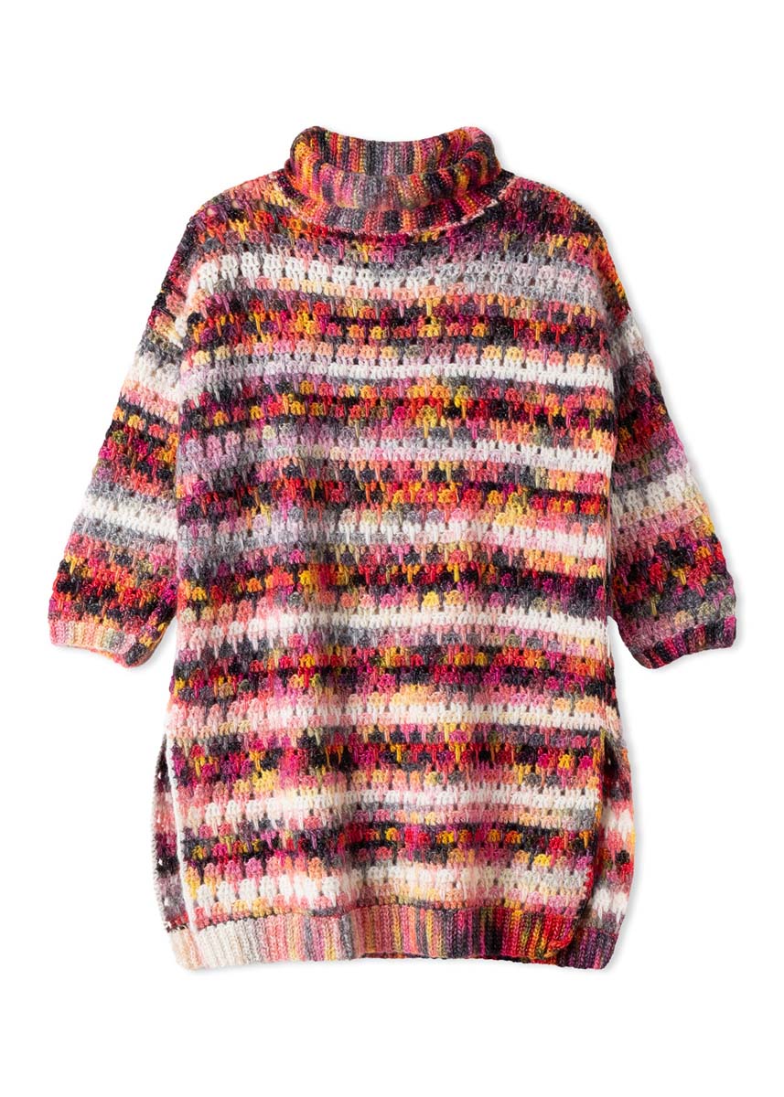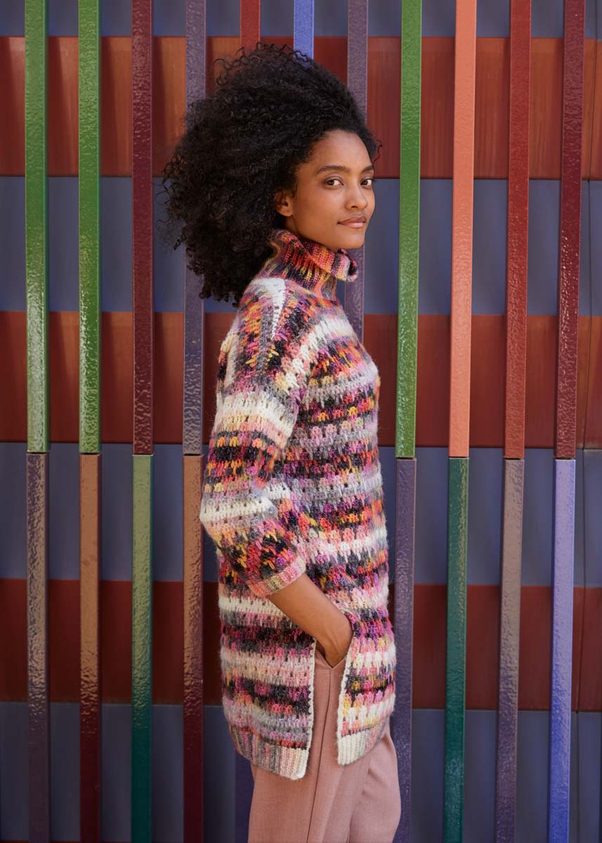 Lana Grossa Picasso (36% ny ull (merino ekstrafin), 36% (baby) alpakka, 28% polyamid, løpelengde = ca. 210 m/50 g), 400 (450 - 500) g i creme/rosa/gammelrosa/grålila/ beige/antrasitt/nougat/vinrød/plomme/oliven/mørkgrå (farge 16); heklenål nr. 4 og nr. 5; 4 maskemarkører (MM).