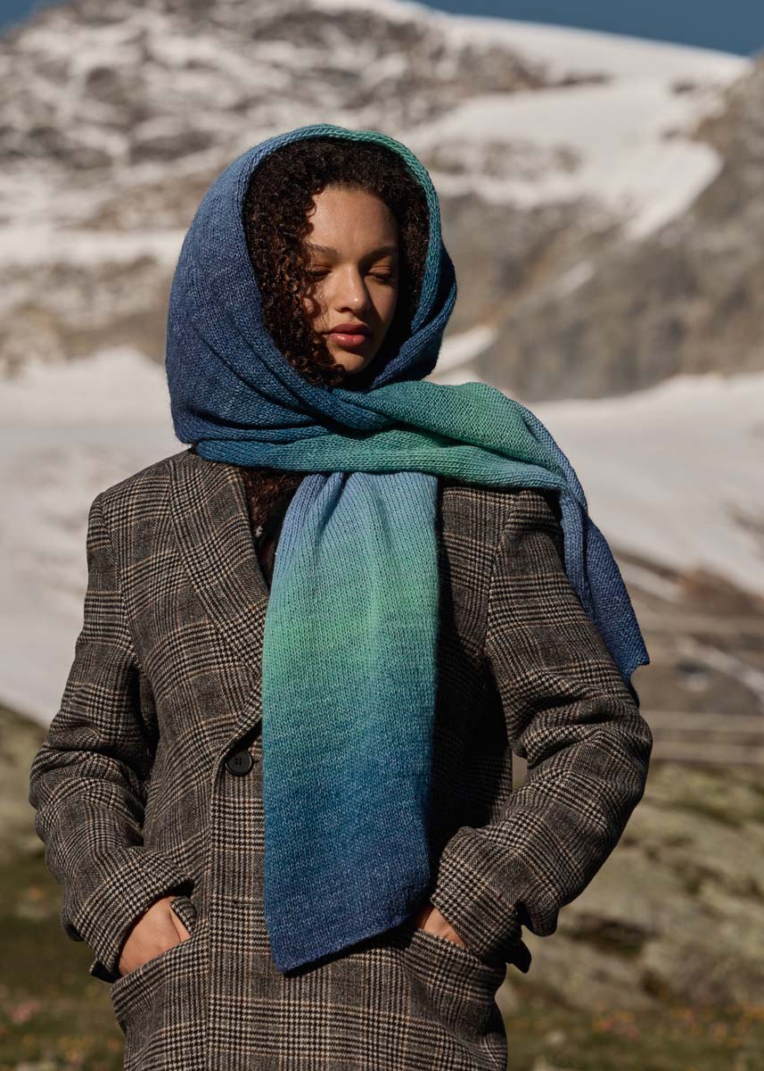 Lana Grossa-kvalitet „Gomitolo Versione“ (60 % ren ny ull, 40 % polyacryl, løpelengde = ca 700 m/200 g): 1 nøster = ca 200 g mørkpetrol/dypsjøgrønn/sjøgrønn/dueblå (farge 456); strikkepinner nr. 5.