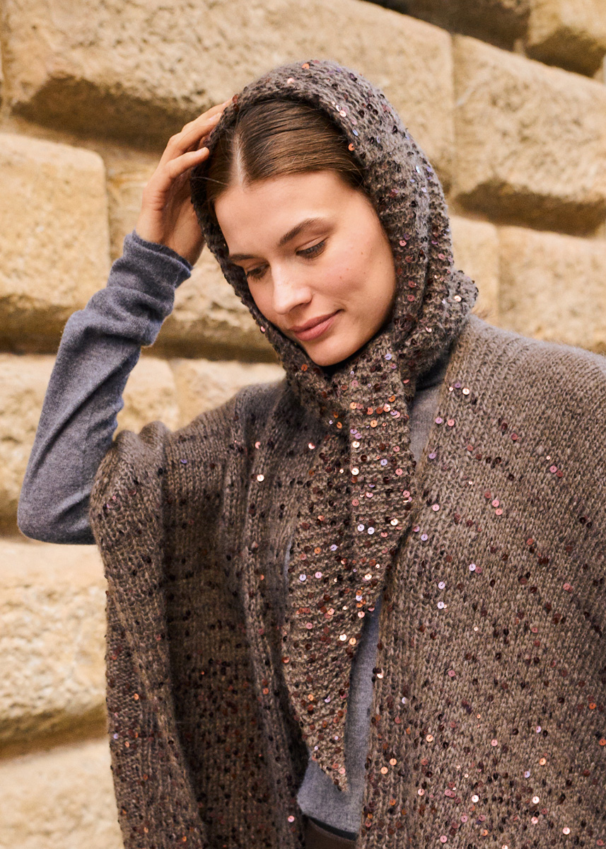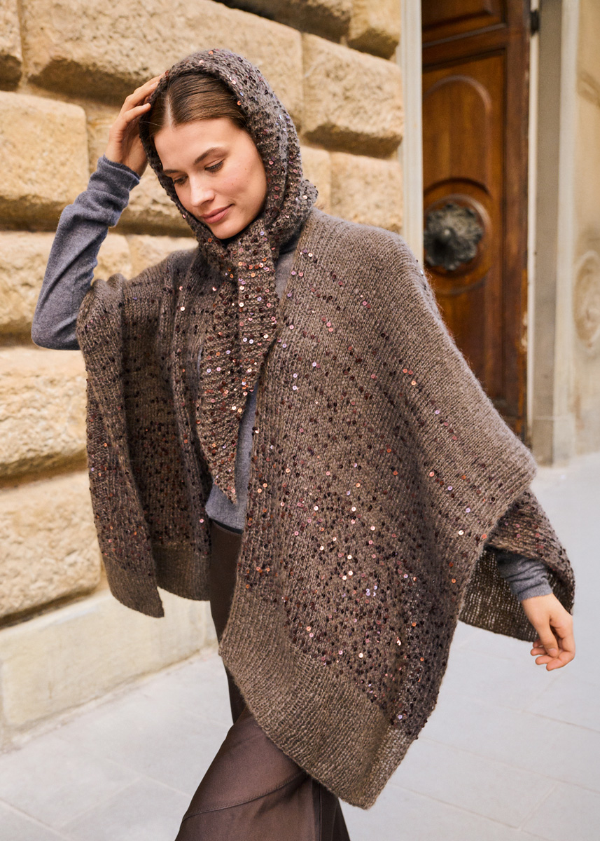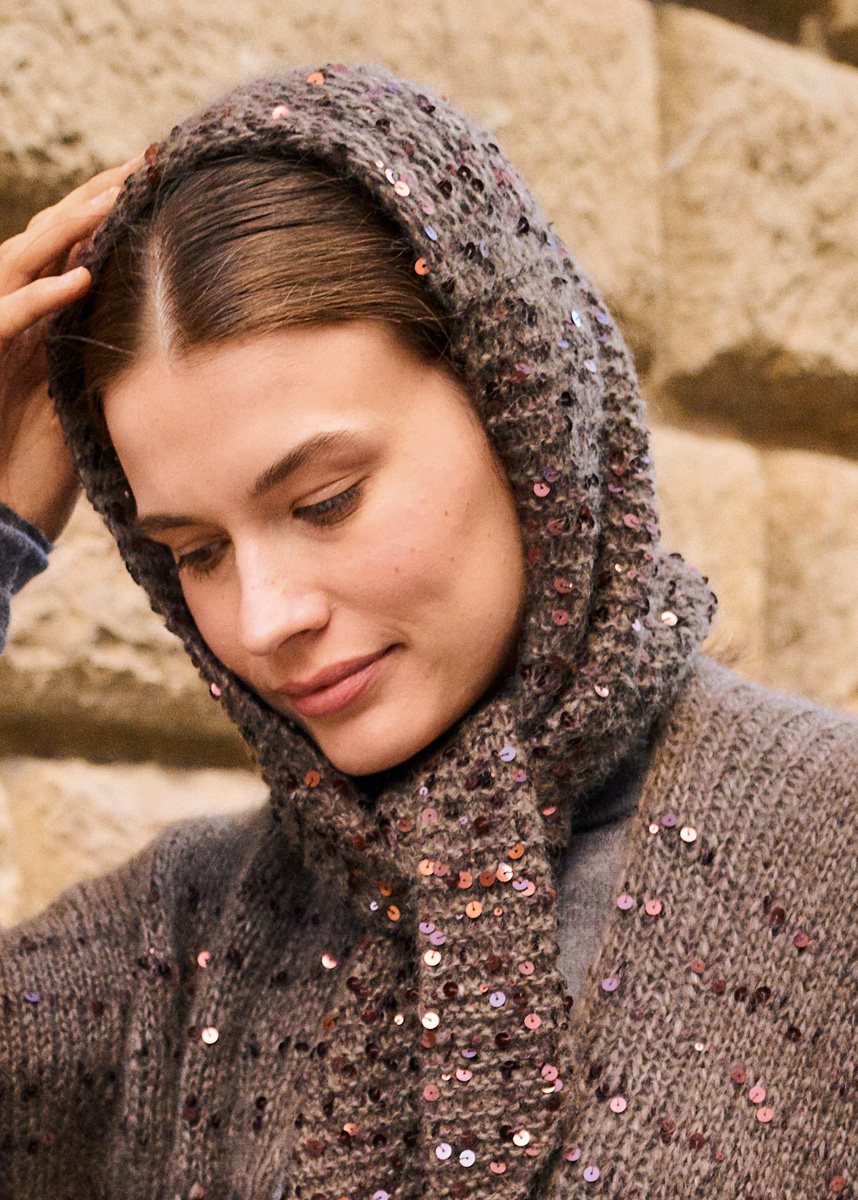 Garn: Lana Grossa «Superkid Seta» (65 % mohair (superkid), 35 % silke, LL = ca. 100 m/25 g): Ca. 100 g gråbrun (frg 26), Lana Grossa «Cosmo» (100 % bomull (pluss paljetter), LL = ca. 260 m/100 g): 100 g mokka (frg 6).
