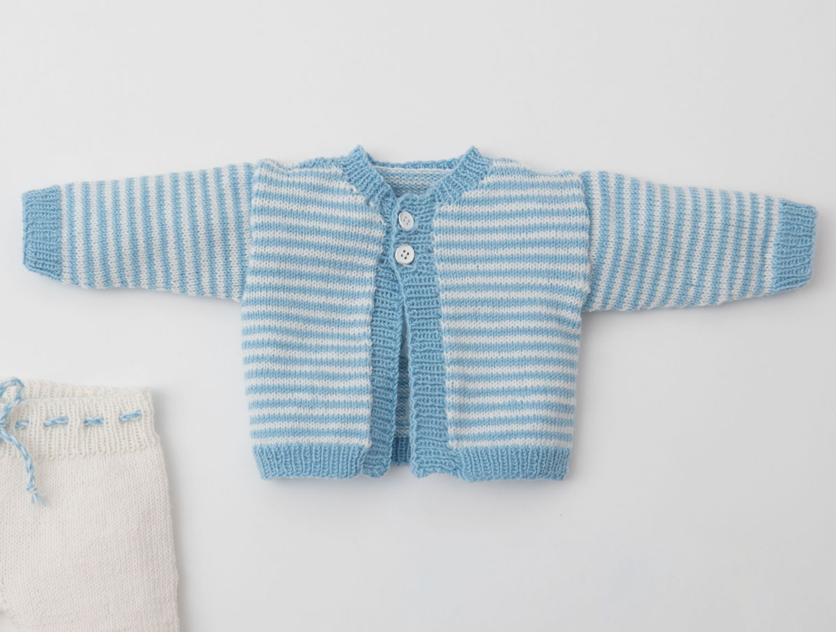 Lana Grossa Cool Wool Baby (100 % Schurwolle, Lauflänge 220 m/50 g) 50 g Weiß (Fb 207) und 50 g Eisblau (Fb 253); Stricknadeln Nr. 3, eine 40 cm lange Rundstricknadel Nr. 3; zwei Knöpfe mit 10 mm Ø.