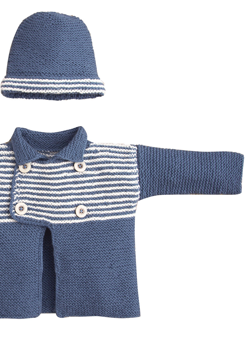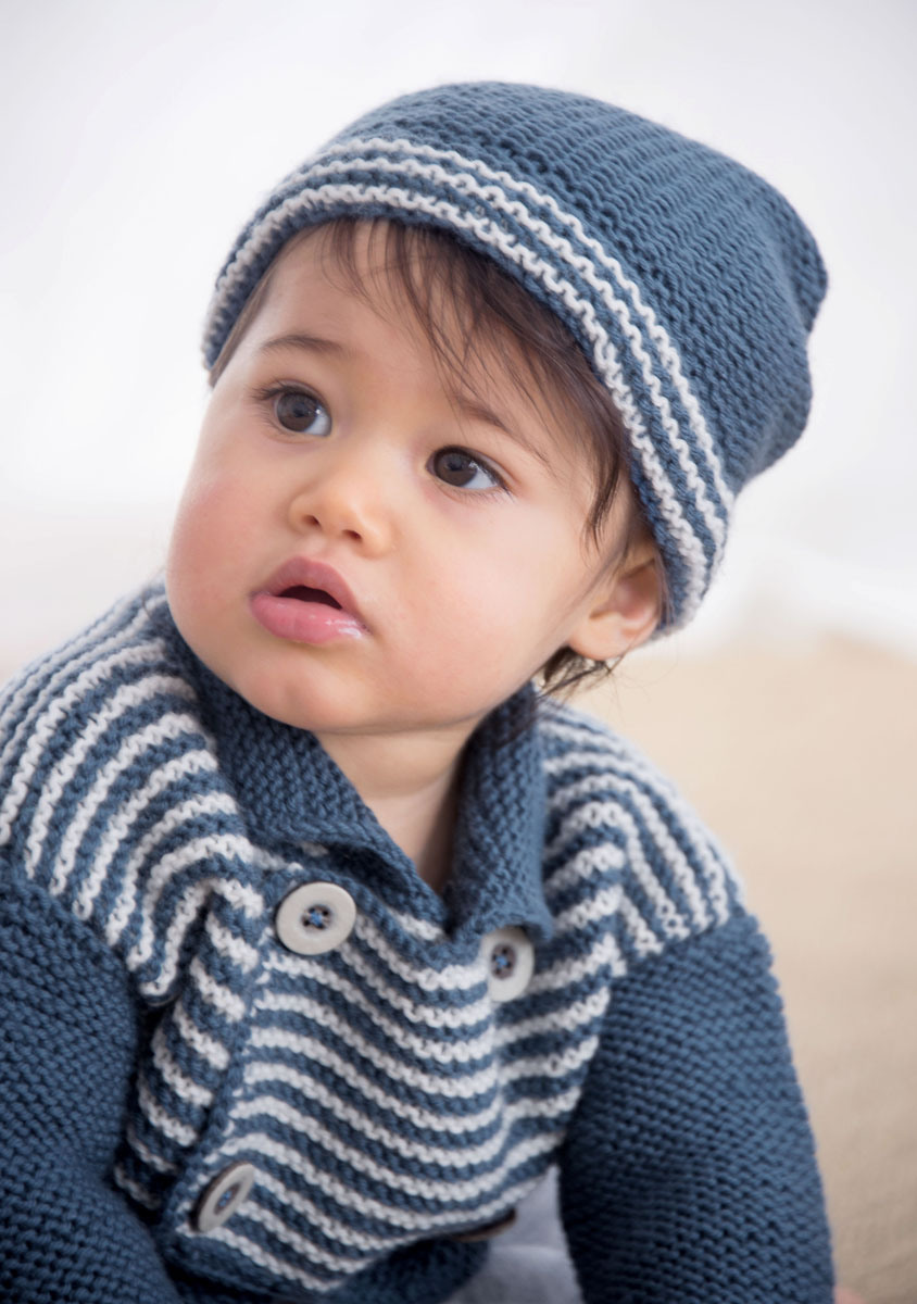 Wie ist heute die Wetterlage? Die Mini-Cabanjacke mit Ringelmuster und kraus gestrickt ist doch ein hübsches und zugleich gut wärmendes Kleidungsstück. Bei einer frischen Brise schützt die Mütze die kleinen Ohren.