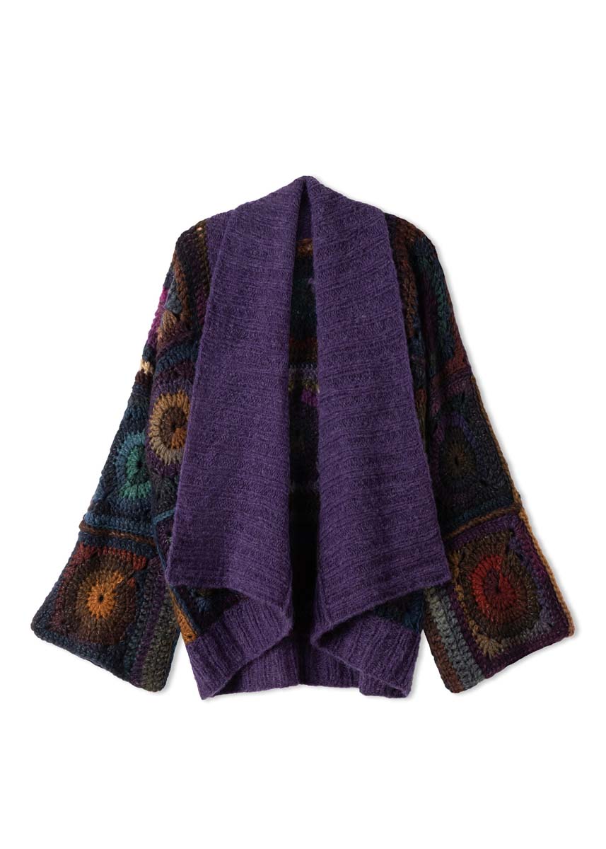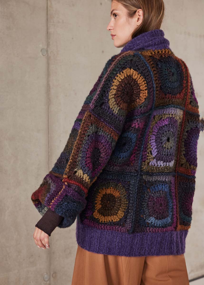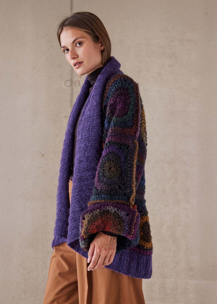 Lana Grossa Bomba (85% ny ull (merino ekstrafin), 15% polyamid, løpelengde 290 m/100 g), 400 g i nougat/mokka/bjørnebær/svartblå/grålila/gråoliv/antrasitt (farge 9) og Lana Grossa Alpaca Air II (50% alpakka (baby), 27% polyamid, 14% bomull, 9% ny ull (merino), løpelengde 140 m/50 g), 150 g i mørkviolett (farge 21); 1 heklenål nr. 8; 1 rundpinne nr. 6, 100 cm lang.