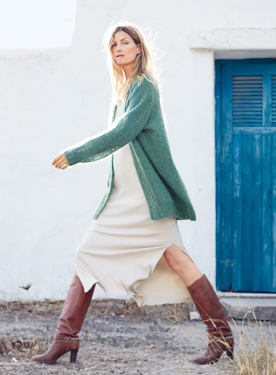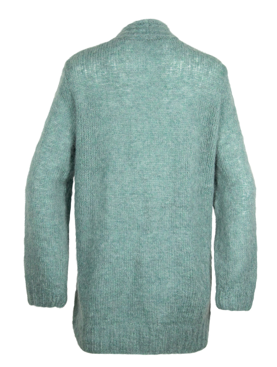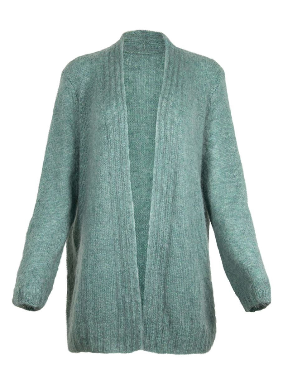 Lana Grossa-kvalitet ”Brigitte No. 3” (40 % mohair, 37 % ren ny uld, 23 % polyamid, løbelængde = ca. 100 m / 25 gr.): ca. 275(300-325) gr grågrøn (fv 17), strikkepinde nr. 4½