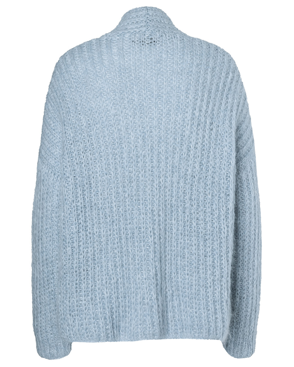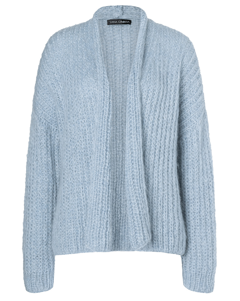 Lana Grossa-kvalitet ”Brigitte No. 3” (40 % mohair, 37 % ren ny uld, 23 % po-lyamid, løbelængde = ca. 100 m / 25 gr.): ca. 375(400-425) gr lyseblå (fv 43), strikkepinde nr. 5½ og 6, hæklenål nr. 5. Bemærk: Modellen strikkes med dobbelt garn.