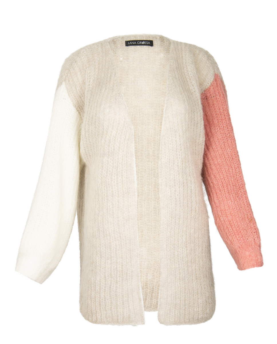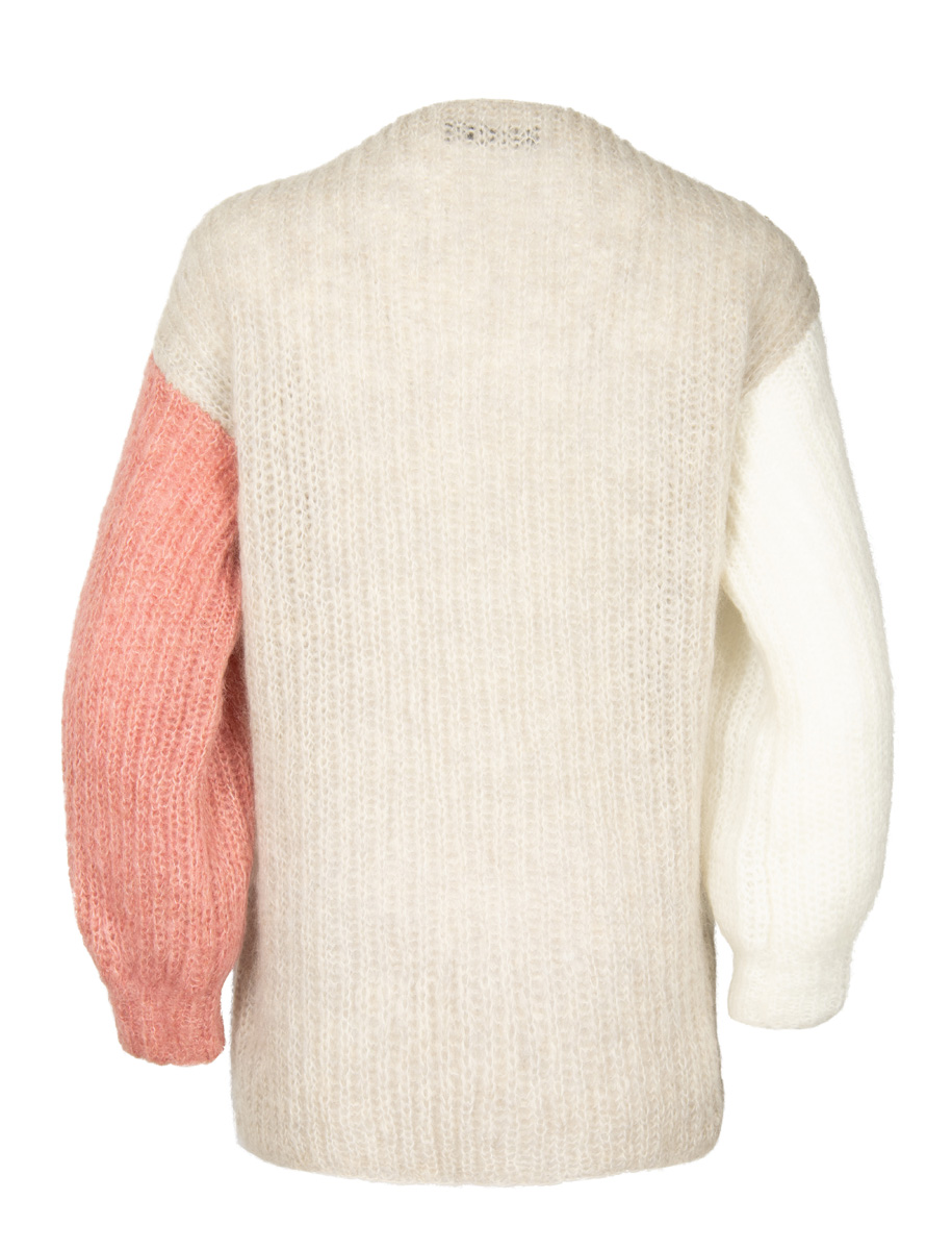 Lana Grossa-kvalitet ”Brigitte No. 3” (40 % mohair, 37 % ren ny uld, 23 % polyamid, løbelængde = ca. 100 m / 25 gr.): ca. 175 gr grège (fv 18) og 50 gr hvid (fv 20) og gammelrosa (fv 25). Strikkepinde nr. 5 og 4½, hæklenål nr. 4