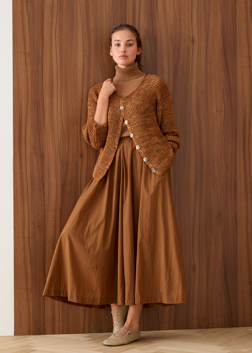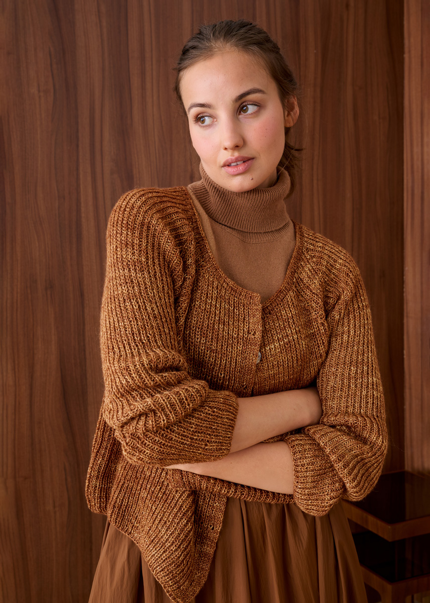 Lana Grossa Brigitte Silkdream (60% ren ny ull (fin merino), 30% silke, 10% mohair (superkid), løpelengde 270 m/50 g), 350 (400 – 450) g kamel (farge 1); strikkepinner nr. 3,5 og 1 rundpinne nr. 3, 40 cm lang, såvel som 6 knapper fra UNION KNOPF, Art. 37604, farge 12, Ø 22 mm.