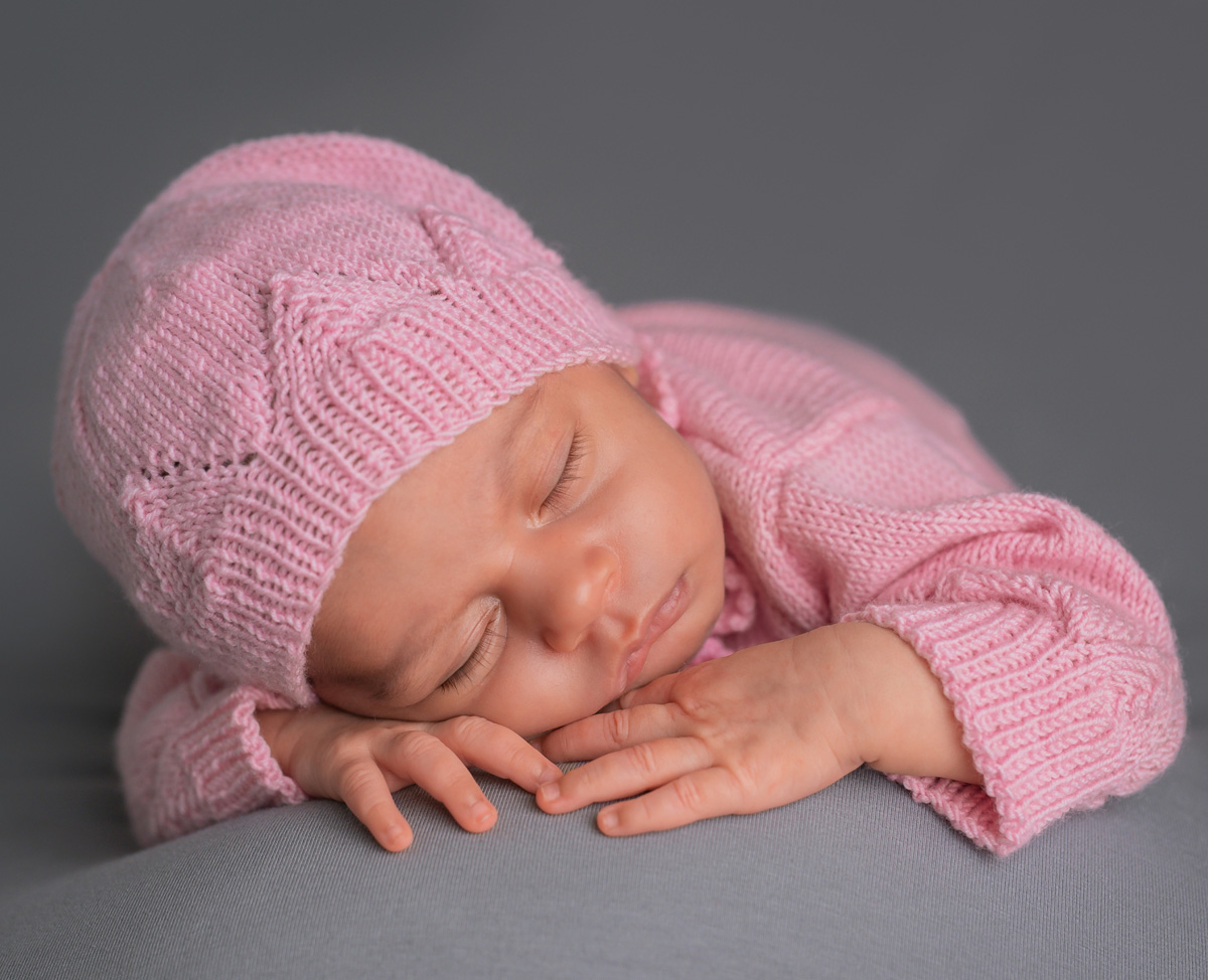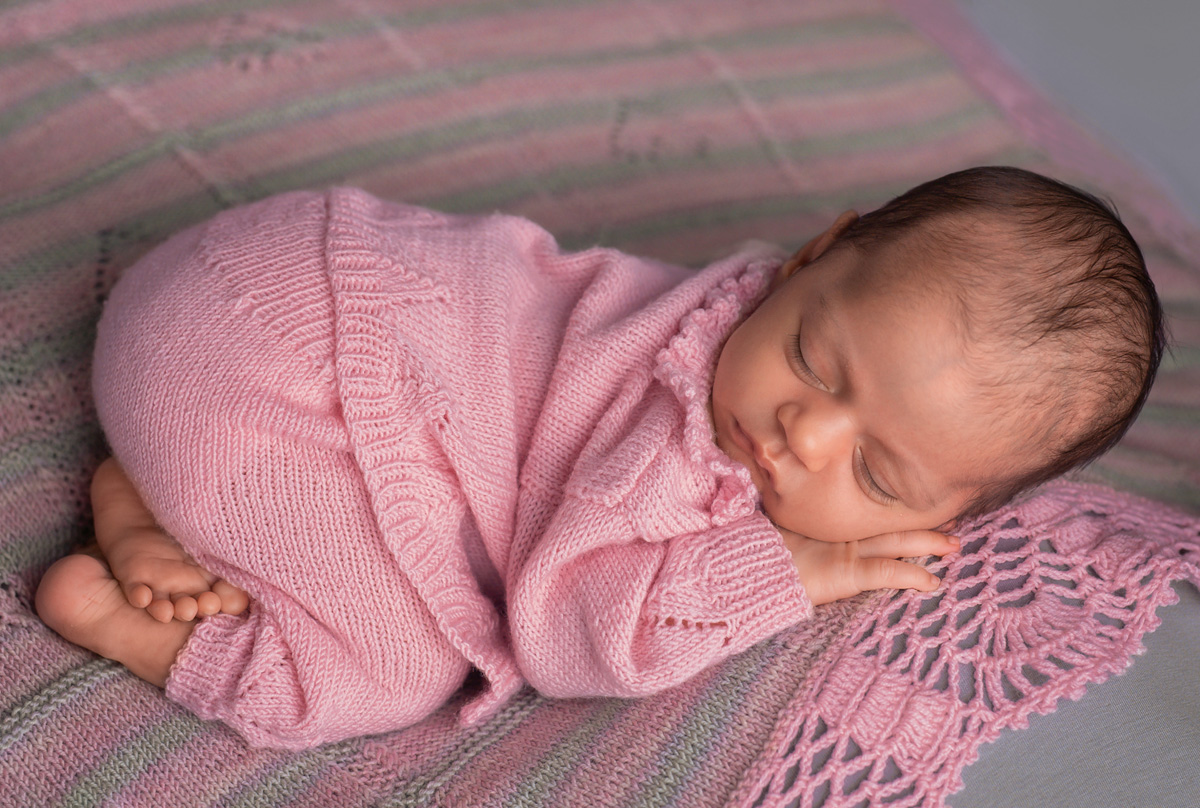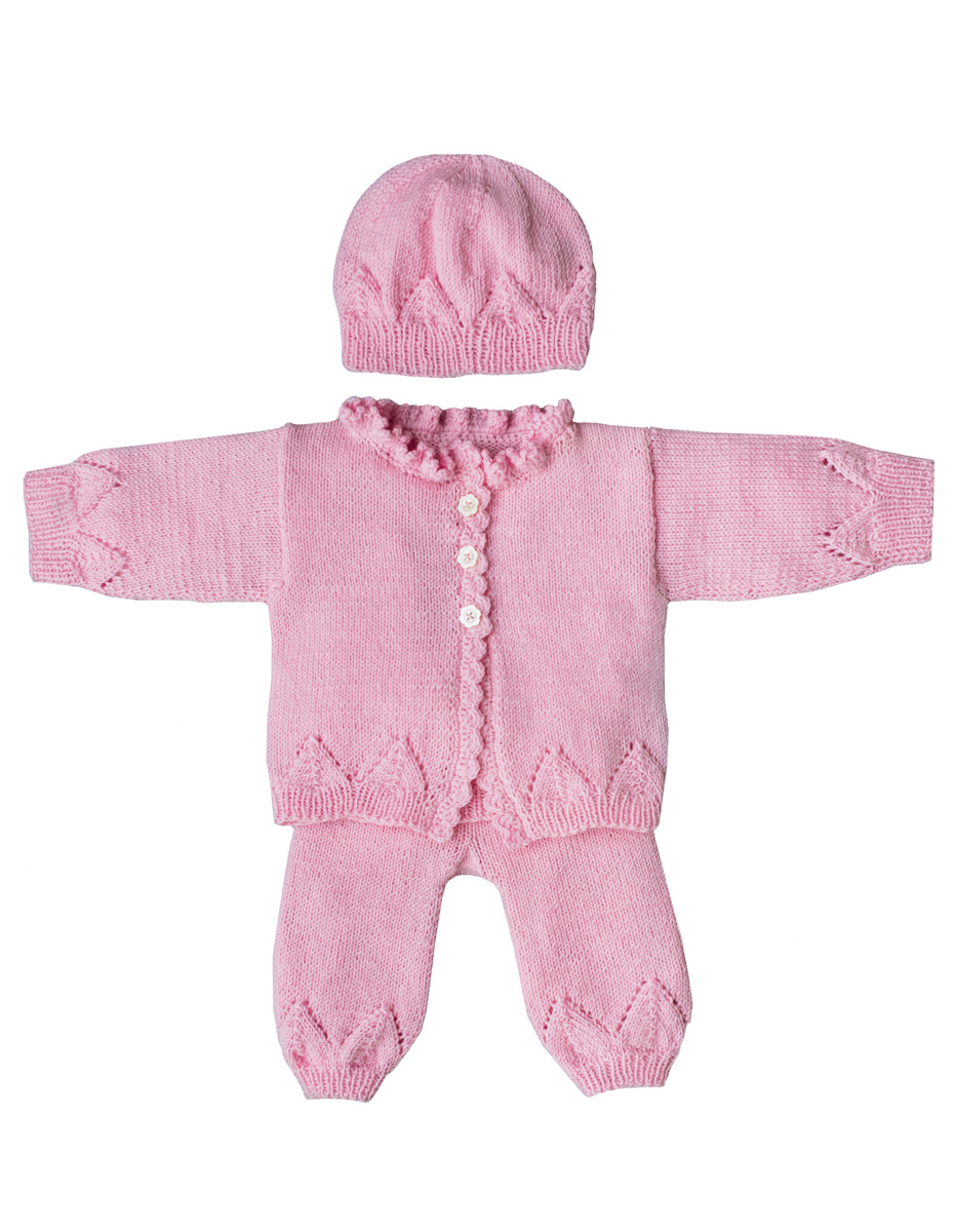 Lana Grossa-kvalitet ”Cool Wool Baby” (100 % ren ny uld, løbelængde = ca. 220 m / 50 gr.): 100 gr rosa (fv 216), strikkepinde nr. 3, hæklenål nr. 2½, 3 knapper 10 mm Ø.