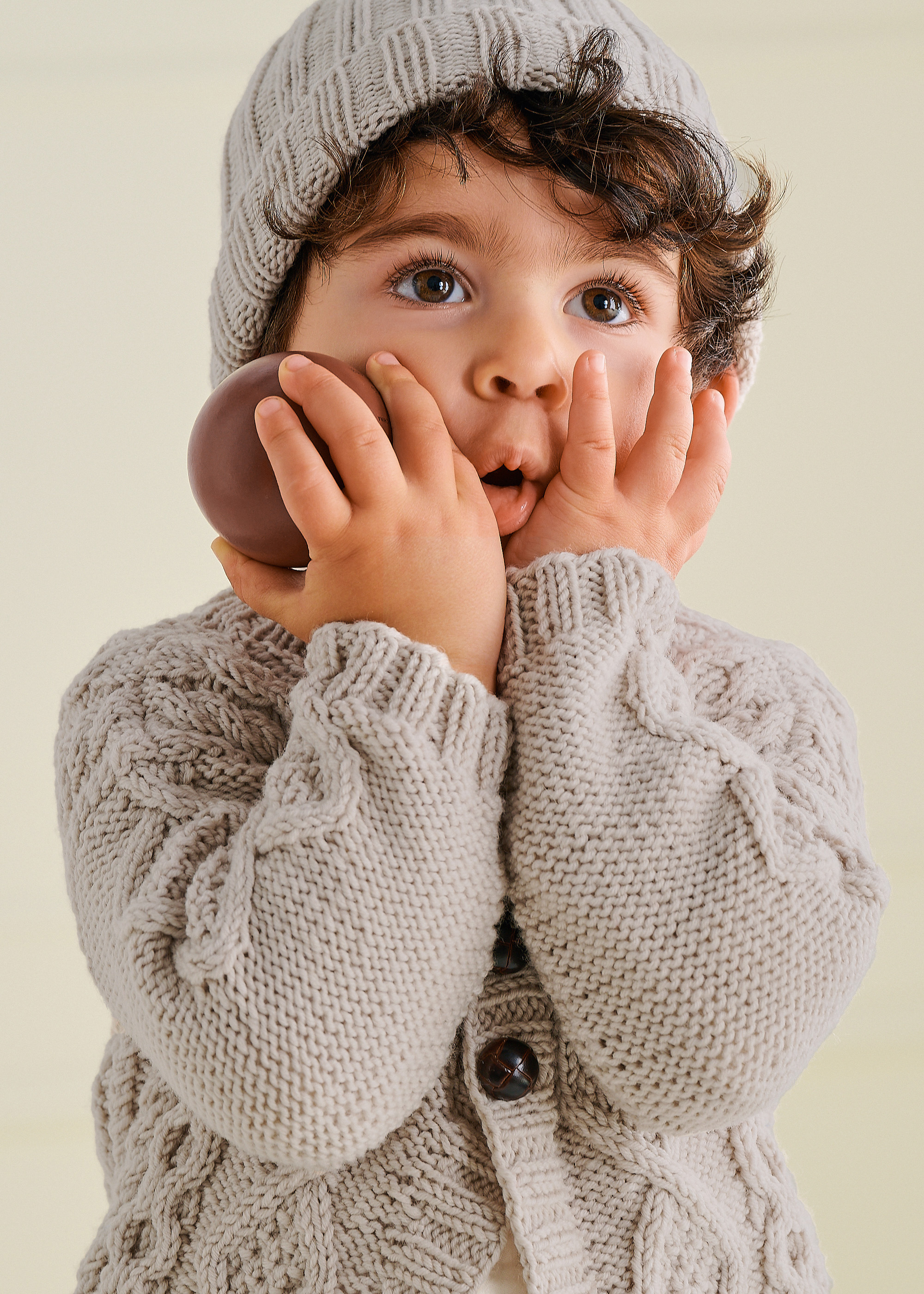 Lana Grossa Cool Wool Big (100% ren ny ull (merino extrafine); løpelengde = 120 m/50 g): 250 g grège (farge 1010); rundpinne nr. og nr. 4; 1 flettpinne; 3 knapper med 20 mm Ø.