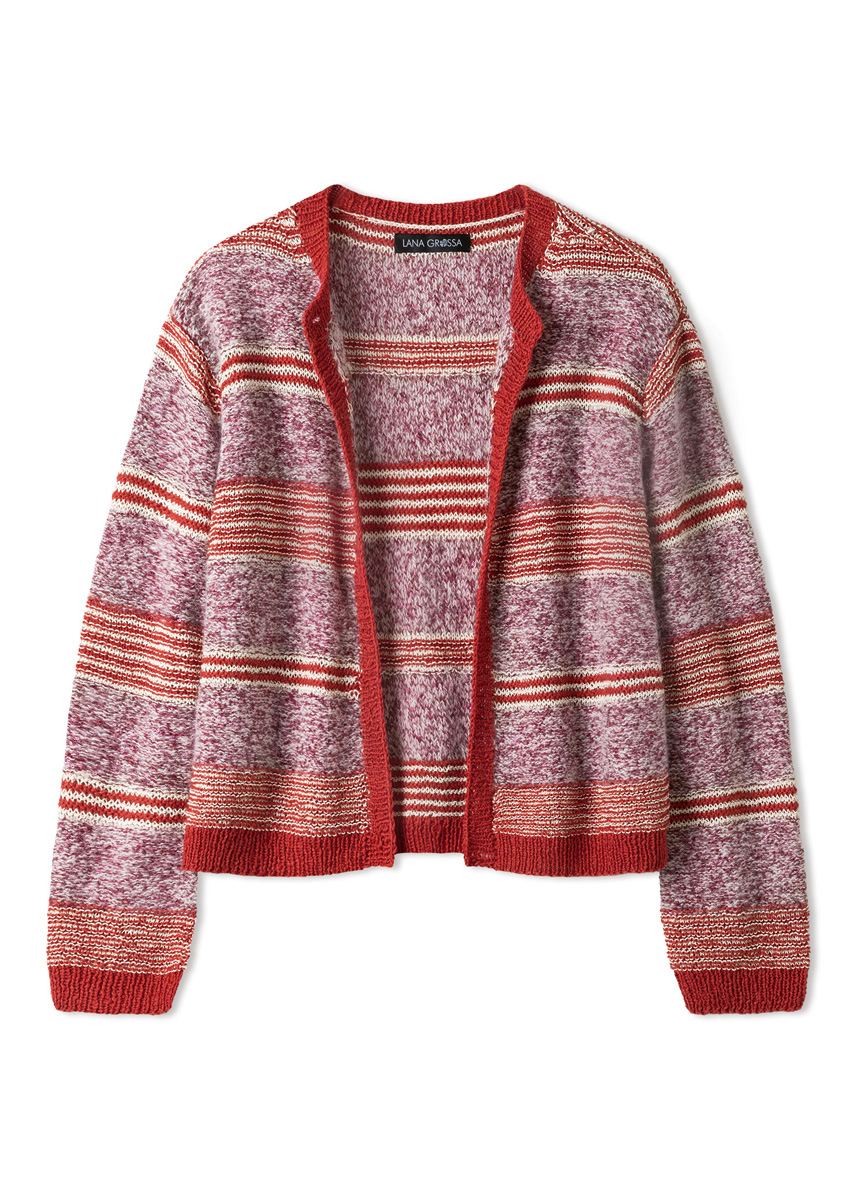 Garn: Lana Grossa «Summer Cashmere» (90 % bomull, 10 % kashmir, LL = ca. 210 m/50 g): Ca. 100 (150 - 150 - 200) g orientrød (frg 25); Lana Grossa «Setasuri» (69 % alpakka (suri), 31 % silke, LL = ca. 212 m/25 g): Ca. 75 (100 - 100 - 125) g krem (frg 2); Lana Grossa «Filo Lurex» (94 % bomull, 6 % polyester, LL = ca. 145 m/50 g): Ca. 100 (100 - 150 - 150) g krem (frg 2); Lana Grossa «Glamour» (55 % polyamid, 45 % polyester, LL = ca. 115 m/25 g): Ca. 125 (125 - 150 - 150) g bordeaux (frg 9). Pinner: Nr. 3 og 4, rundpinne nr. 3.