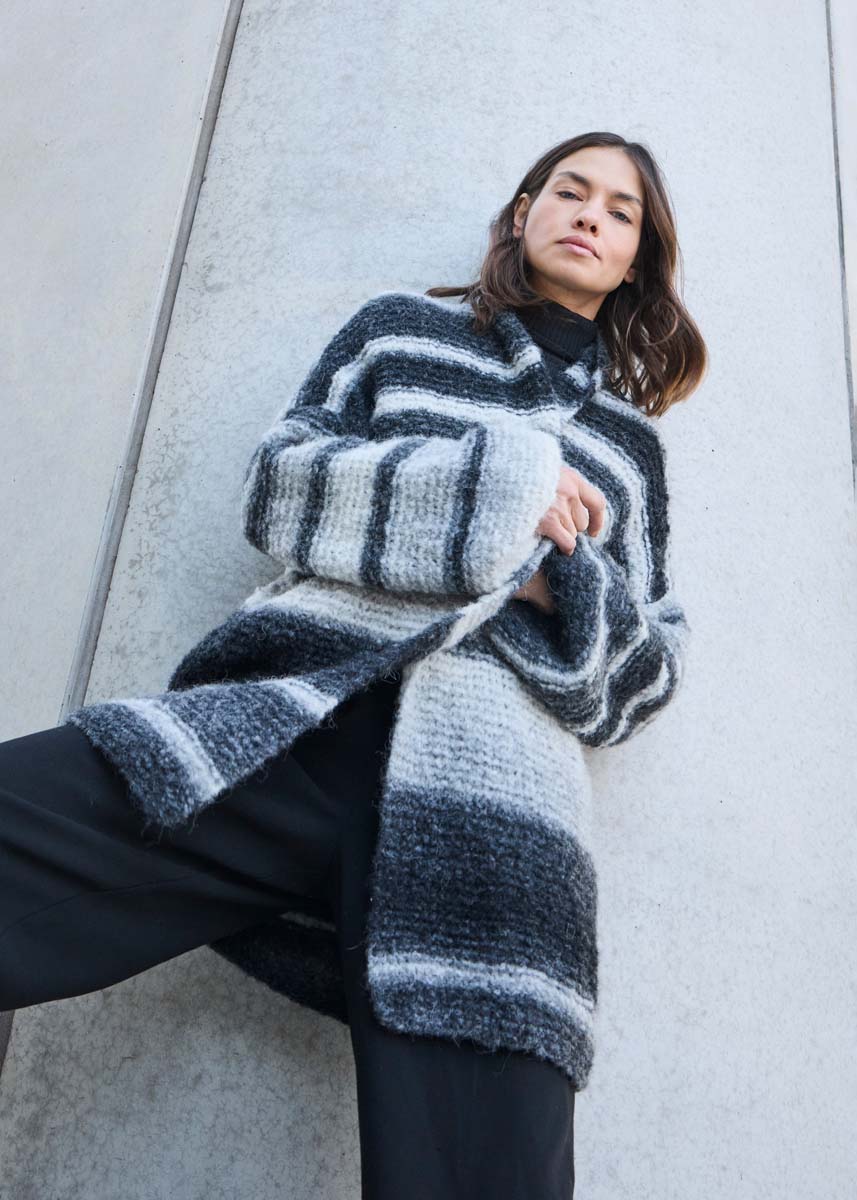 Lana Grossa-kvalitet „Gigante“ (70 % alpakka (fin), 30 % polyamid, løpelengde = ca 300 m/100 g): ca 500 (500 - 600 - 600) g Sølv/lysgrå/mørkgrå/antrasitt (farge 12); strikkepinner nr. 4,5 og 5,5.