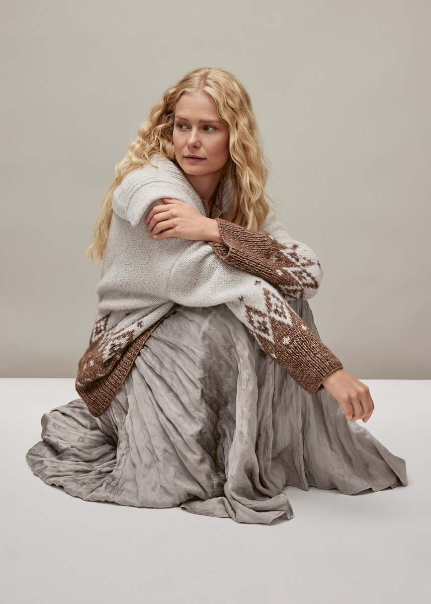 Garn: Lana Grossa Natural Alpaca Pelo (63 % bomull, 31 % alpakka (baby), 6 % ren ny ull (merino), LL = 125 m / 50 g): 400 (450 / 500 / 500) g natur/lys grå (frg 36) og 200 (250 / 250 / 250) g mørk brun melert (frg 8) og Lana Grossa Glamour (55 % polyamid, 45 % polyester, LL = 115 m / 25 g): 25 g mokkabrun (frg 14). Pinner: Rundpinne 4 og 5,5 mm, 80–100 cm lang. Tilbehør: 3 treknapper 25 mm Ø.