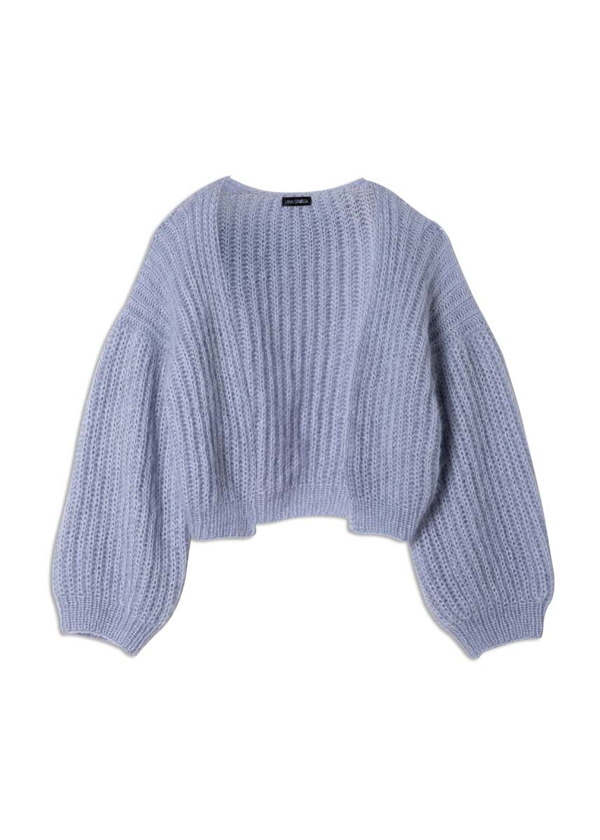Lana Grossa-kvalitet „Silkhair” (70 % mohair (superkid), 30 % silke, løpelengde = ca. 210 m/25 g): ca. 425 (450 – 475) g lysende grå (farge 189); 1 rest glatt kontrastgarn til opplegg; pinner nr. 6 og 8, rundpinne nr. 8, 50 og 100 cm lang, rundpinne nr. 6, 40 og 100 cm lange.