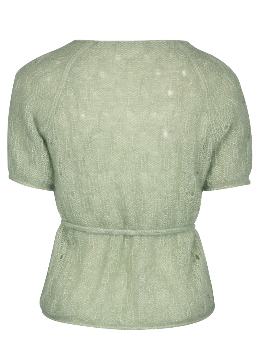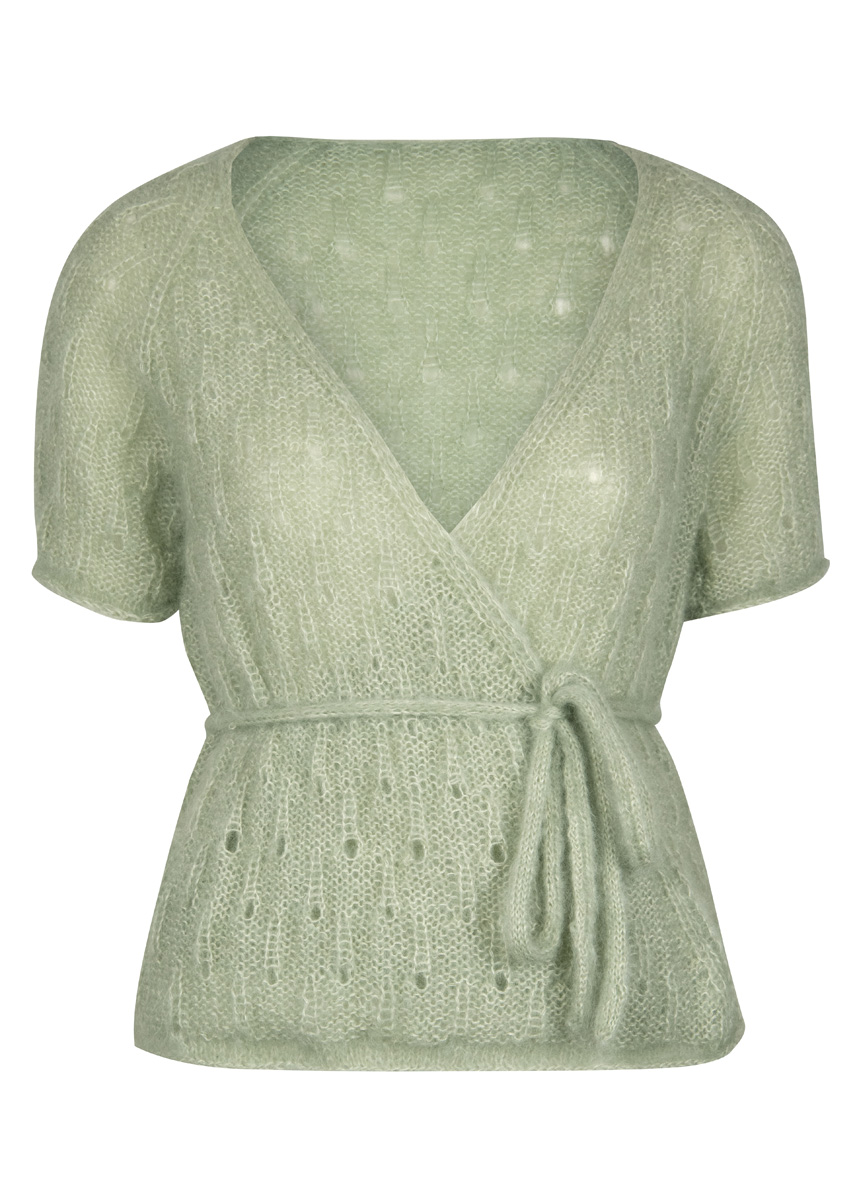 Lana Grossa-kvalitet ”Silkhair” (70 % (superkid) mohair, 30 % silke, løpelengde = ca. 210 m / 25 gr.): ca. 175(200-225) gr lys grønn (farge 140), strikkepinner nr. 4 og 5, rundpinne nr. 5, 80 cm, heklenål nr. 3½, 2 settpinner nr. 3½.