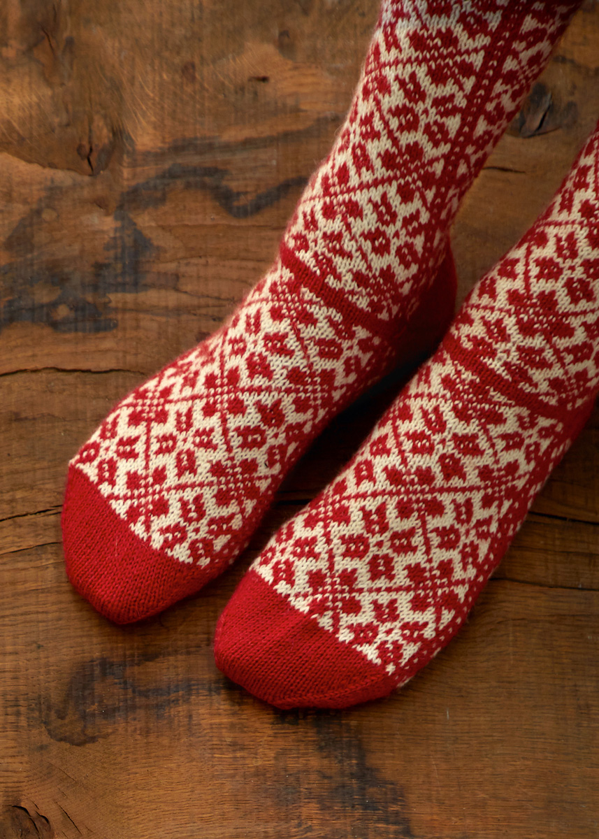 Lana Grossa-kvalitet ”Meilenweit 50” (80 % ren ny uld, 20 % polyamid, løbelængde = ca. 420 m / 100 gr.): 100 gr mørkerød (fv 1323) og råhvid (fv 1113), strømpepinde nr. 2½, 2 maskemarkører