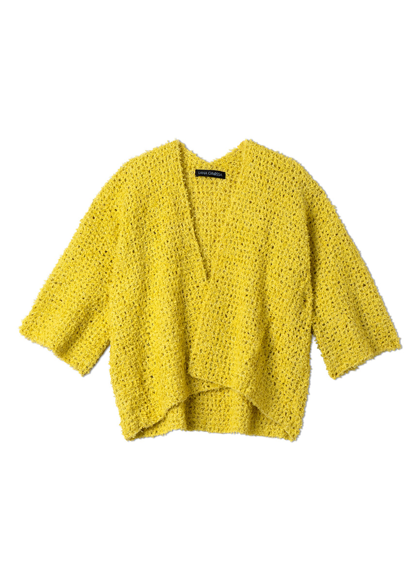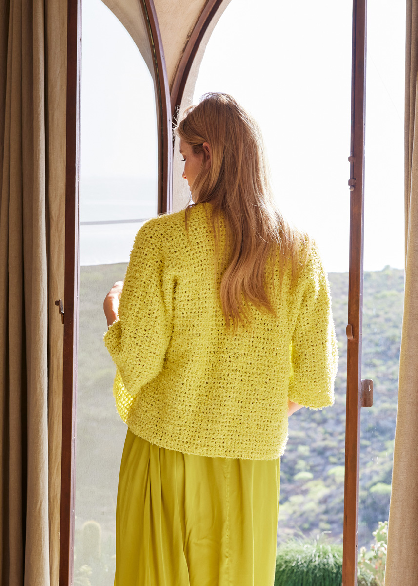 Lana Grossa Frizzante (54% bomull, 46% polyamid, løpelengde = ca. 105 m/50 g), 400 (450 - 500 - 550) g i Zitrusgul (farge 10). 1 heklenål nr. 3,5.