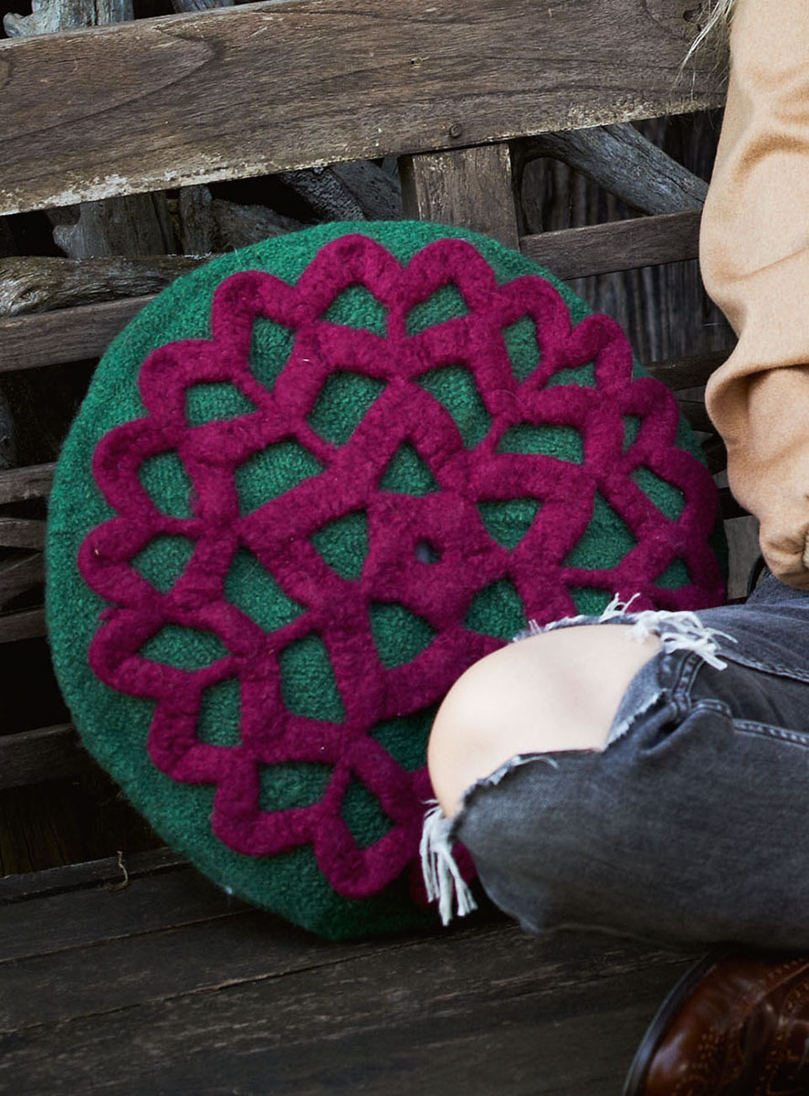 Lana Grossa Qualität „Feltro“ (100 % Schurwolle, LL = 50 m/50 g), 450 g Grasgrün (Fb. 11), 200 g Zyklam (Fb. 62); Nadelspiel und Rundstricknadel Nr. 8; Häkelnadel Nr. 10; rundes Kisseninlett mit Ø 50 cm; Allesnäher in passenden Farben; Handnähnadel