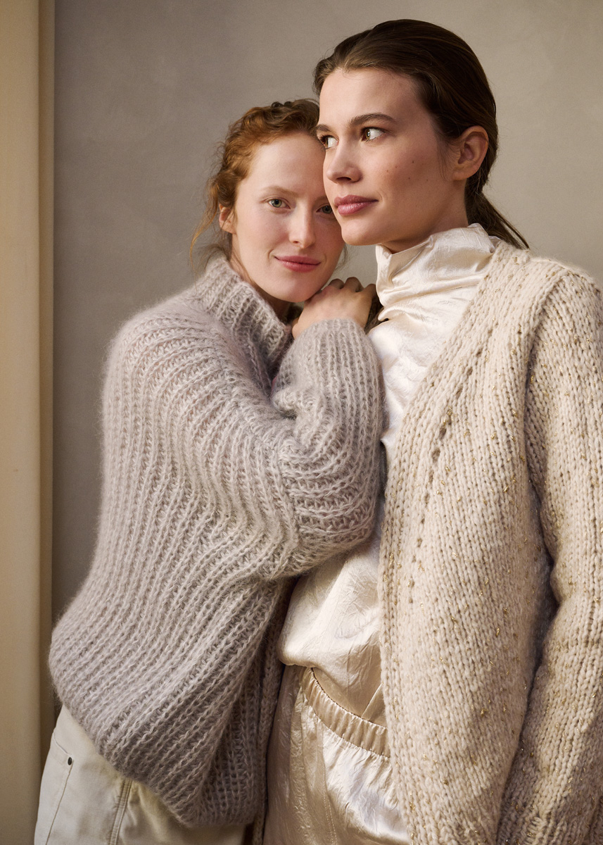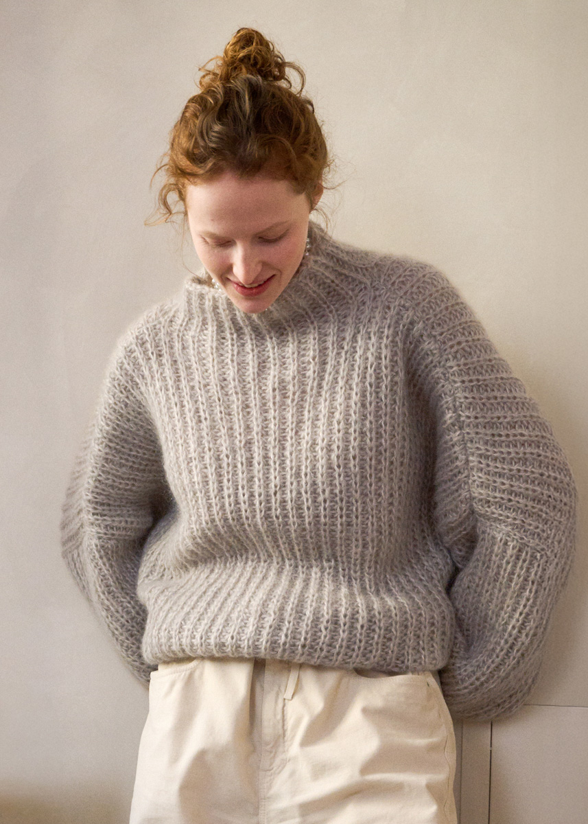 Garn: Lana Grossa «Superkid Seta» (65 % mohair (superkid), 35 % silke, LL = ca. 100 m/25 g): ca. 200 (225 - 225 - 250) g gråbeige (frg 18), Lana Grossa «Silkhair» (70 % mohair (superkid), 30 % silke, LL = ca. 210 m/25 g): Ca. 225 (225 - 250 - 250) g lys beige (frg 18).