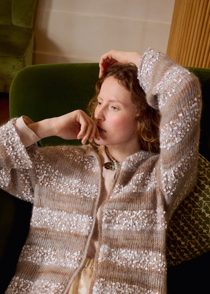 Den lange jakken blir strikket i ett stykke ovenfra og ned