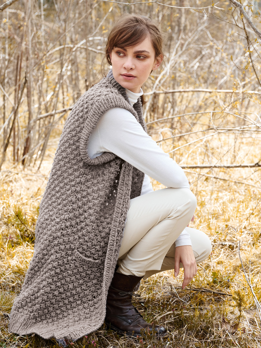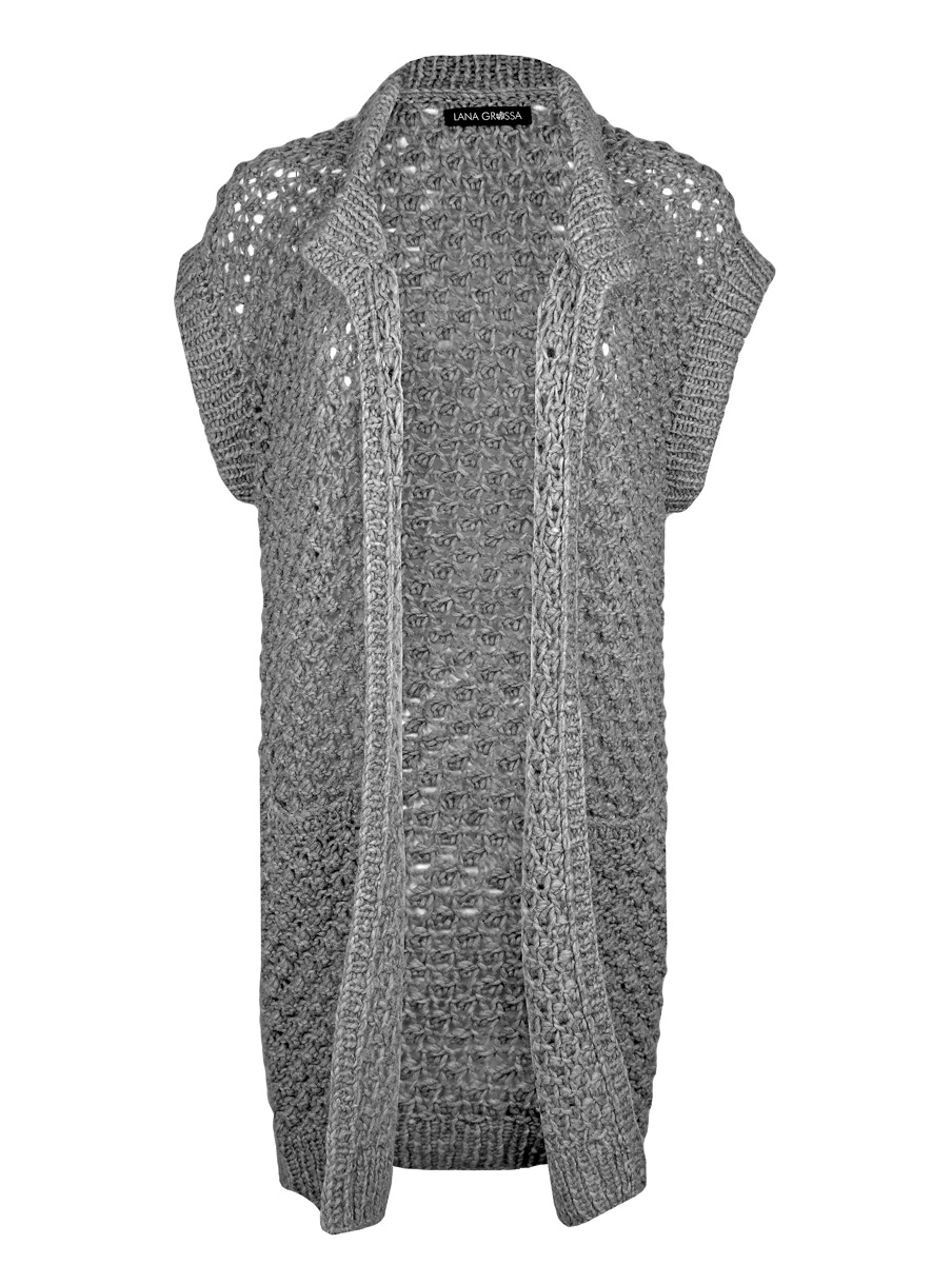 Lana Grossa Cool Air (55% jomfru ull merino, 33% baby alpakka, 12% polyamid, løpelengde 125 m/50 g), 350 (400 – 450 – 500) g gråbeige (farge 2); pinner nr. 7 og 9, 1 rundpinne nr. 7, 40 cm lang.