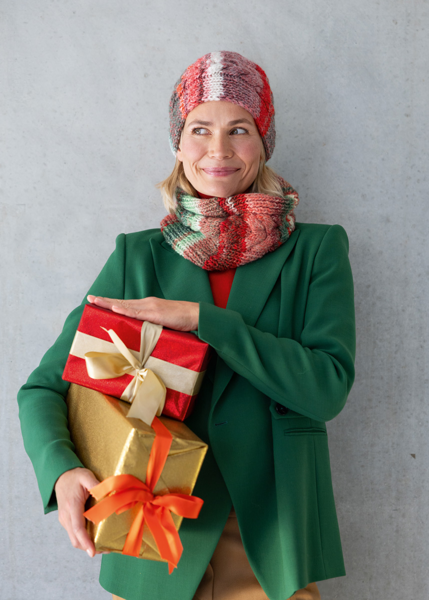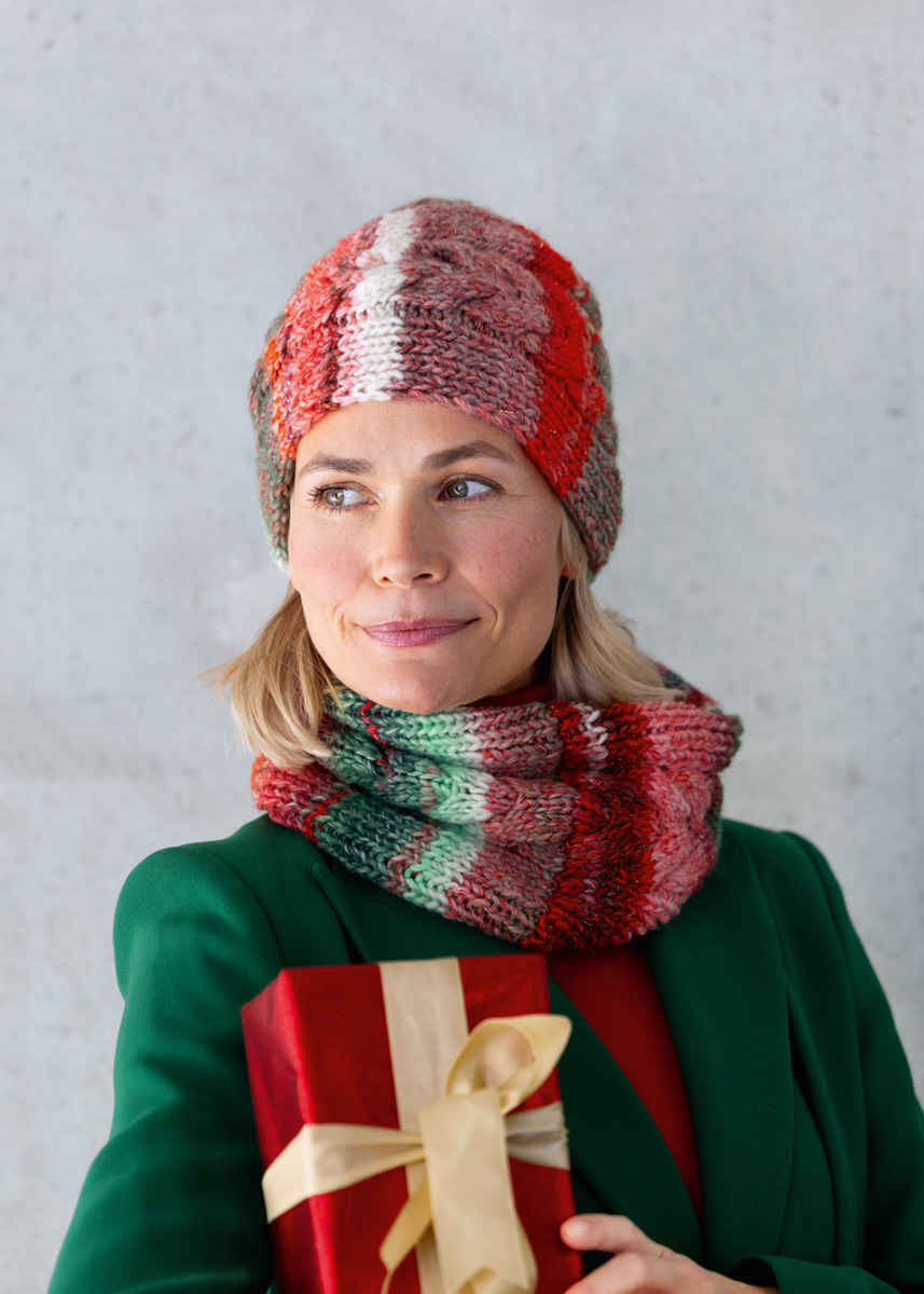 Lana Grossa-kvalitet Christmas Edition Big Lurex (60% ren ny ull, 40% polyacryl, løpelengde = ca 180 m/100 g): 100 g grårød/rød/ecru/svartrød/hvitrød/orange/mørk grønn/hvitgrønn/mørk grå/mørk rød variert stripete (farge 203); Strikkepinner nr. 6; 1 flettepinne.