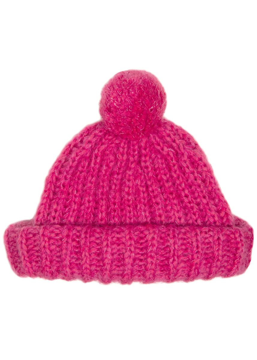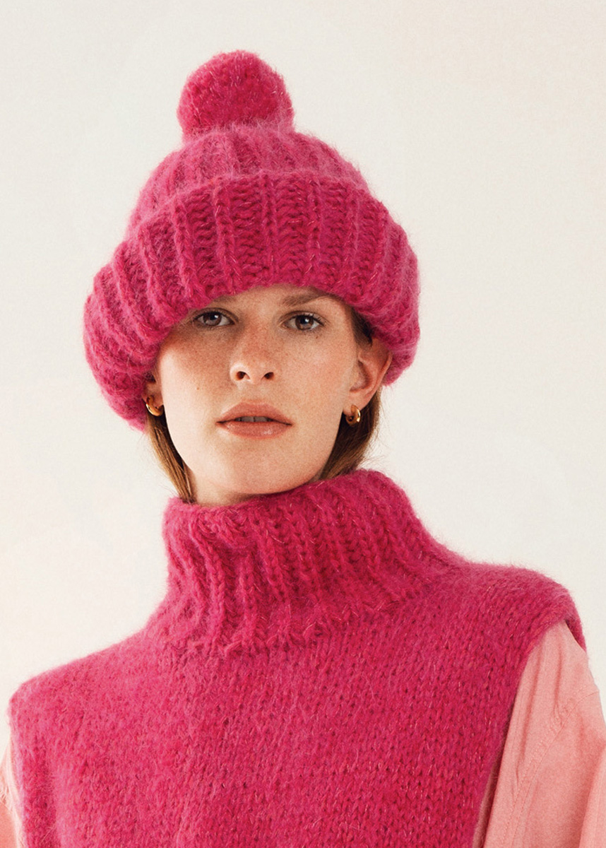 Lana Grossa-kvalitet ”Brigitte No. 2” (47 % alpaka, 45 % bomuld, 8 % ren ny uld, løbelængde = ca. 140 m / 50 gr.): ca. 100 gr pink (fv 19), og Lana Grossa-kvalitet ”Brigitte No. 3” (40 % mohair, 37 % ren ny uld, 23 % polyamid, løbelængde = ca. 100 m / 25 gr.): ca. 50 gr pink (fv 28), strømpepinde nr. 6.