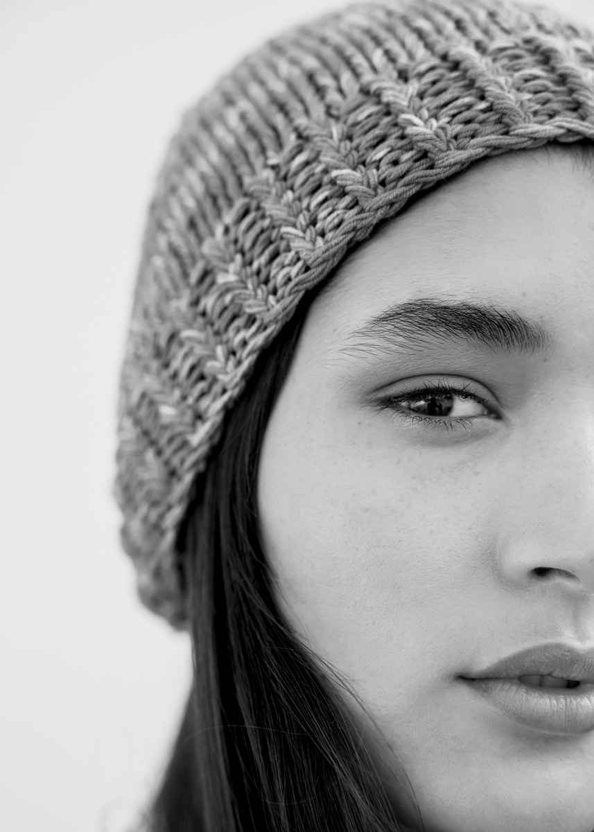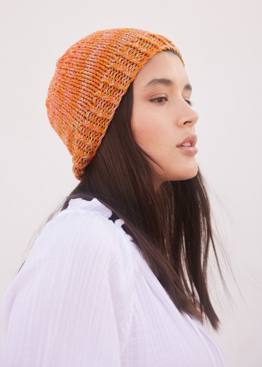 Lana Grossa-kvalitet „Gomitolo Baleno“ (80 % bomull, 20 % polyamid, löplängd = ca 370 m/100 g): 1 nystan = ca 100 g orange/laxrosa/beige/ljusgrön/grönbeige (färg 221); 1 kort rundsticka eller strumpstickor nr. 6. Mössan stickas med fyrdubbla trådar.