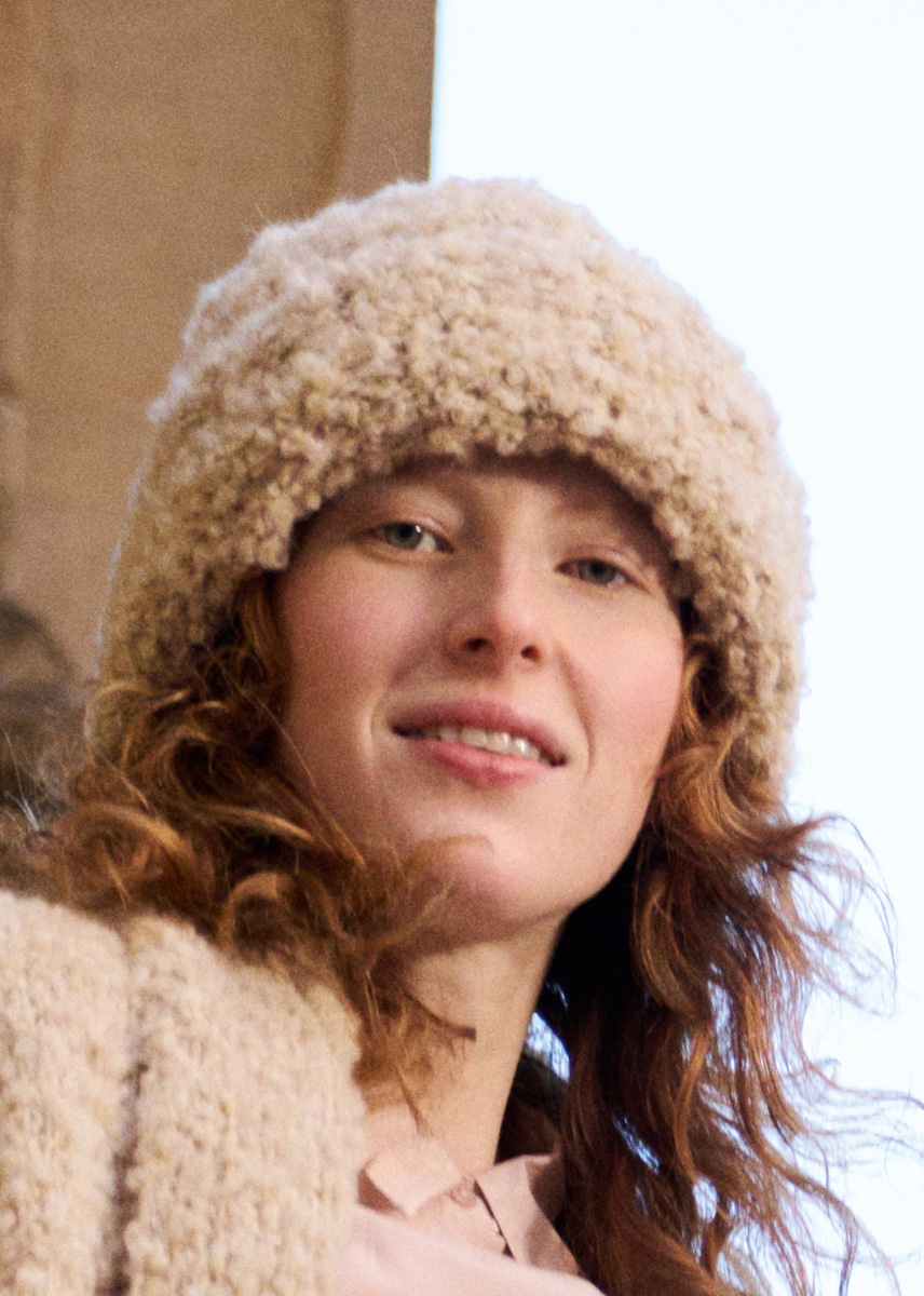 Garn: Lana Grossa «Orsetto» (60 % ren ull (merino), 40 % alpakka (superfine), LL = ca. 75 m/50 g): 100 g beige (frg 6). Pinner: Kort rundp og/eller strømpep nr. 9.
