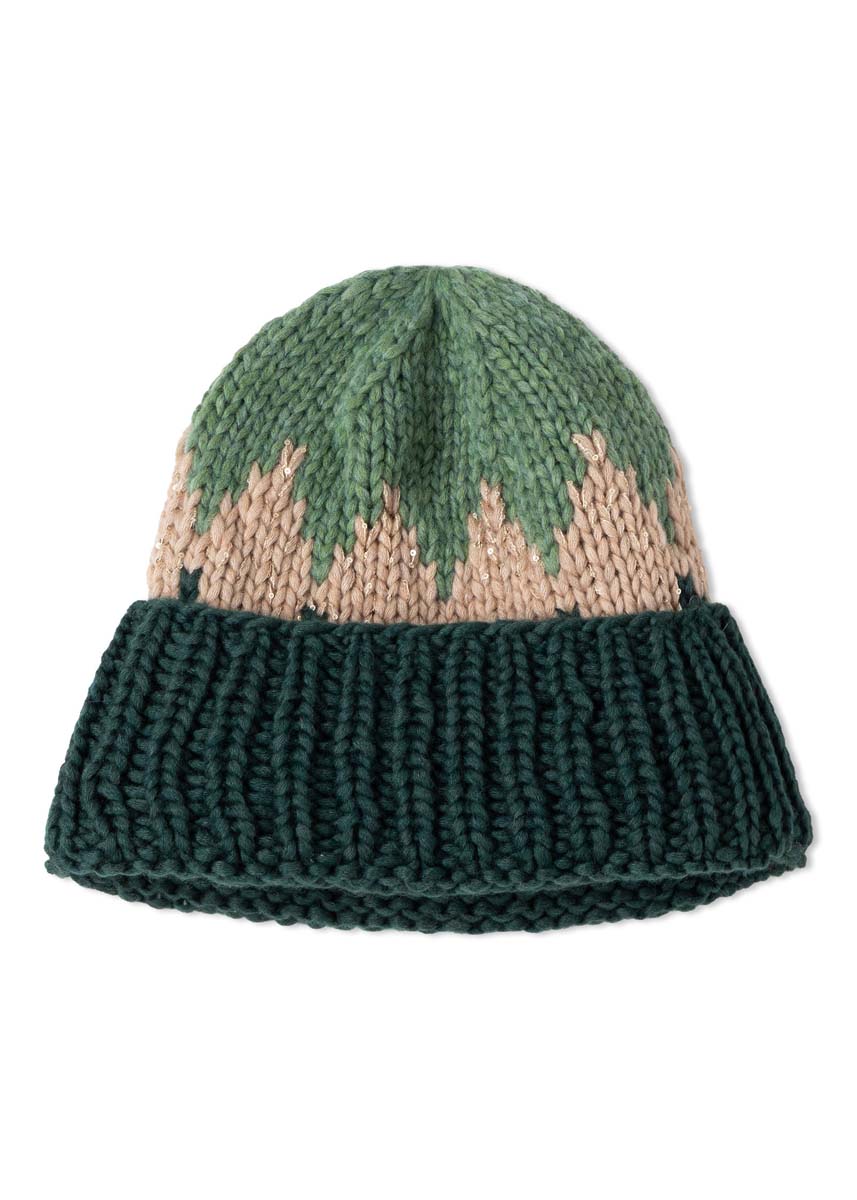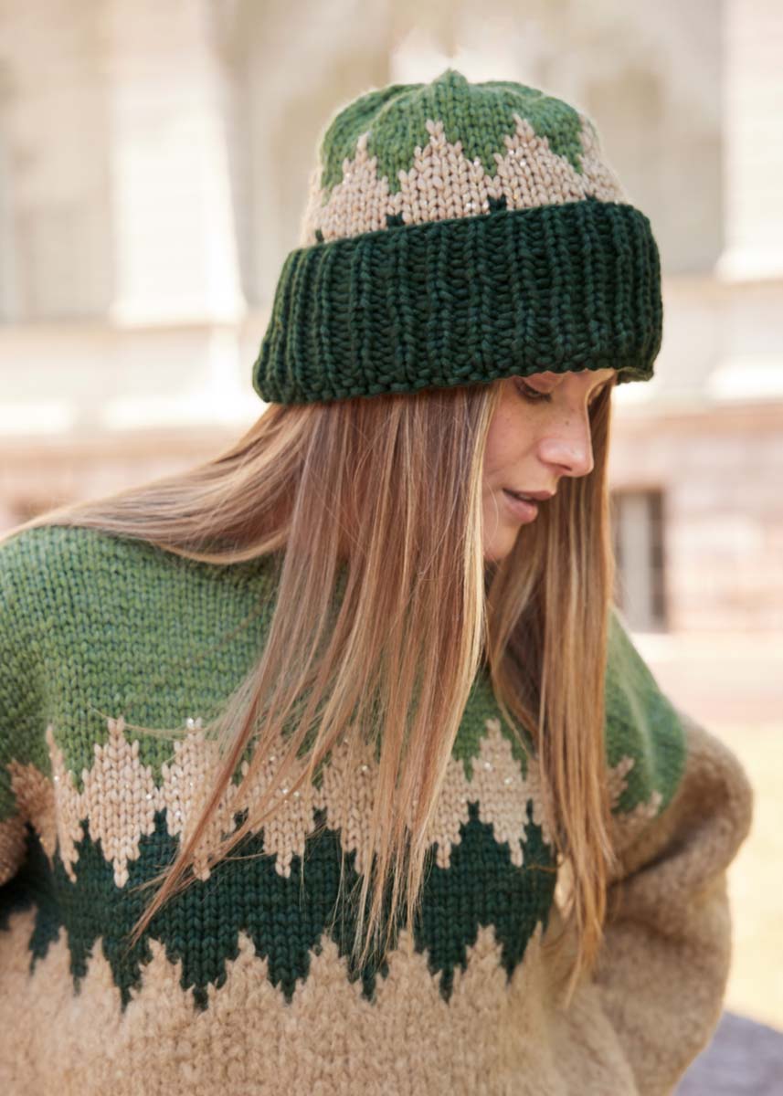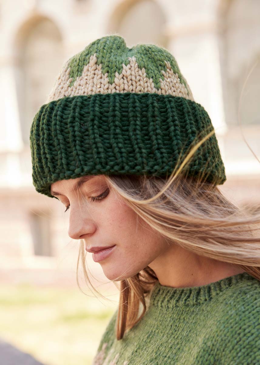 Lana Grossa Winter Softness (62% ny ull (merino ekstrafin), 38% bomull, løpelengde = ca. 70 m/50 g), 50 g i skoggrønn (farge 4), 50 g i mørkgrønn (farge 5), 50 g i beige (farge 18) og Lana Grossa Glamour (55% polyamid, 45% polyester, løpelengde = ca. 112 m/25 g), 25 g i beige (farge 10); 5 settpinner nr. 7; 6 maskemarkører (MM).