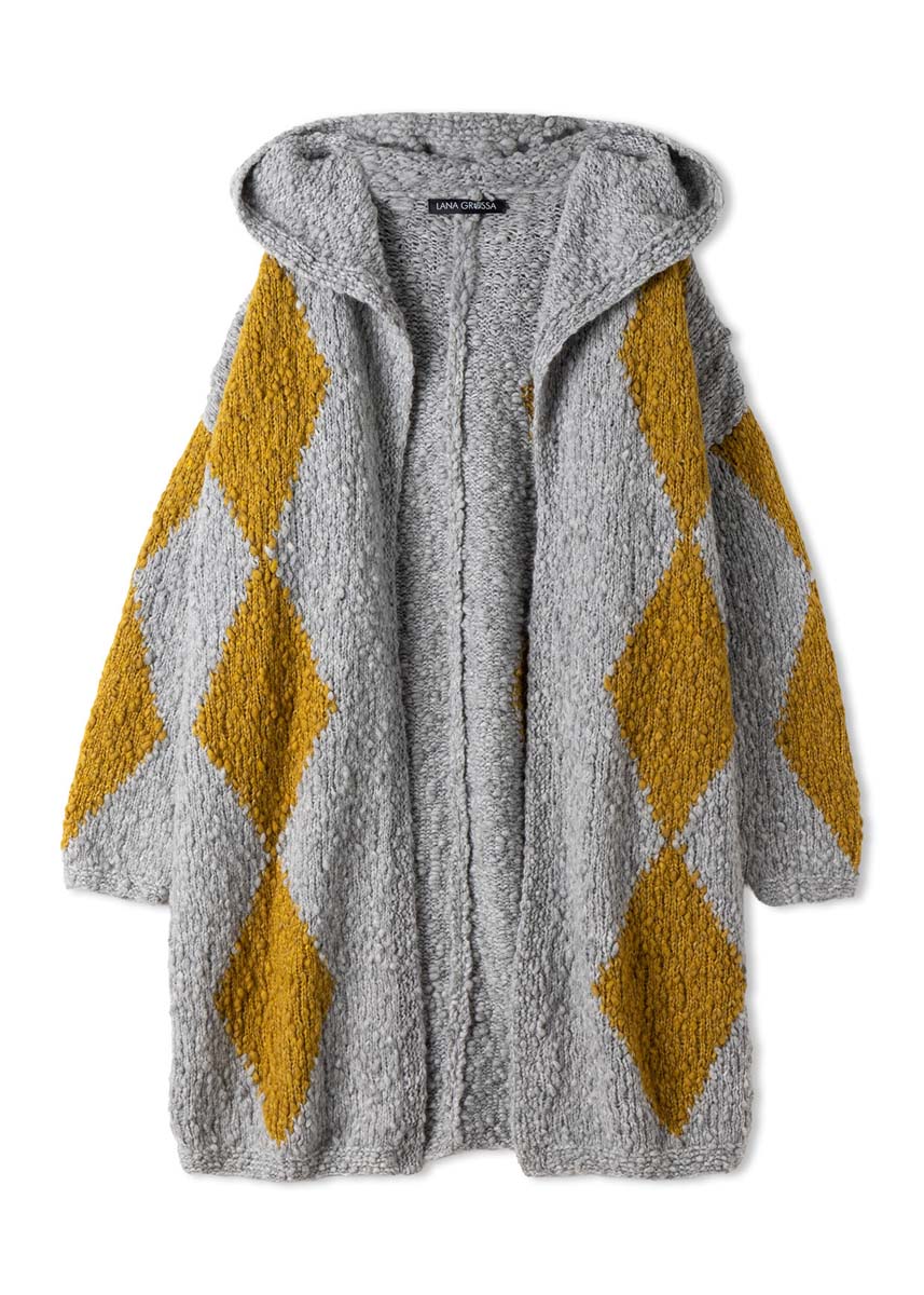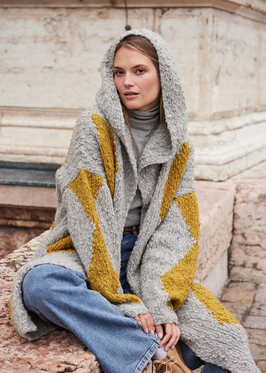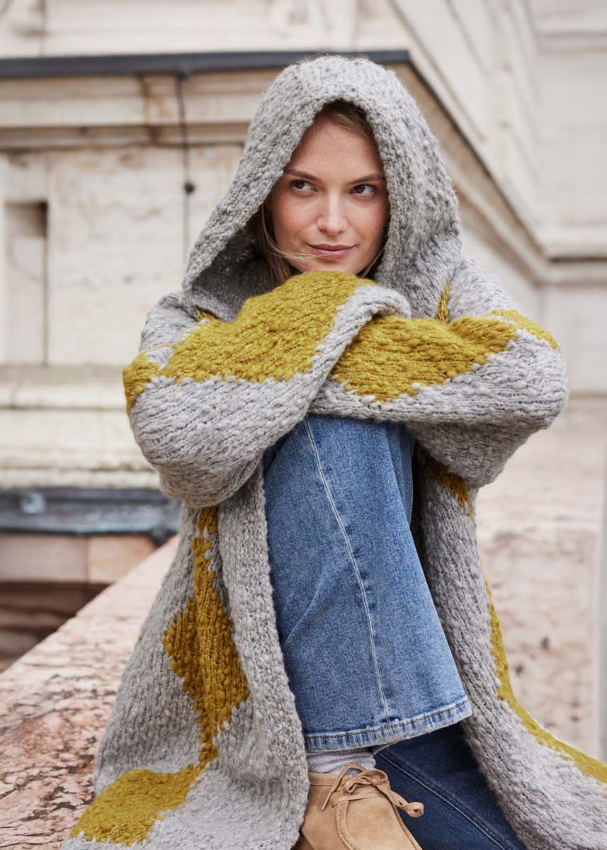 Lana Grossa Caramella (53% ny ull (merino), 25% (baby) alpakka, 22% polyamid, løpelengde 110 m/50 g), 600 (650) g i lys grå (farge 12) og 200 g i sennepgul (farge 6); strikkepinner nr. 4,5 og nr. 5; 1 rundpinne nr. 5, 60 cm lang; 1 rundpinne nr. 4,5, 150 cm lang.