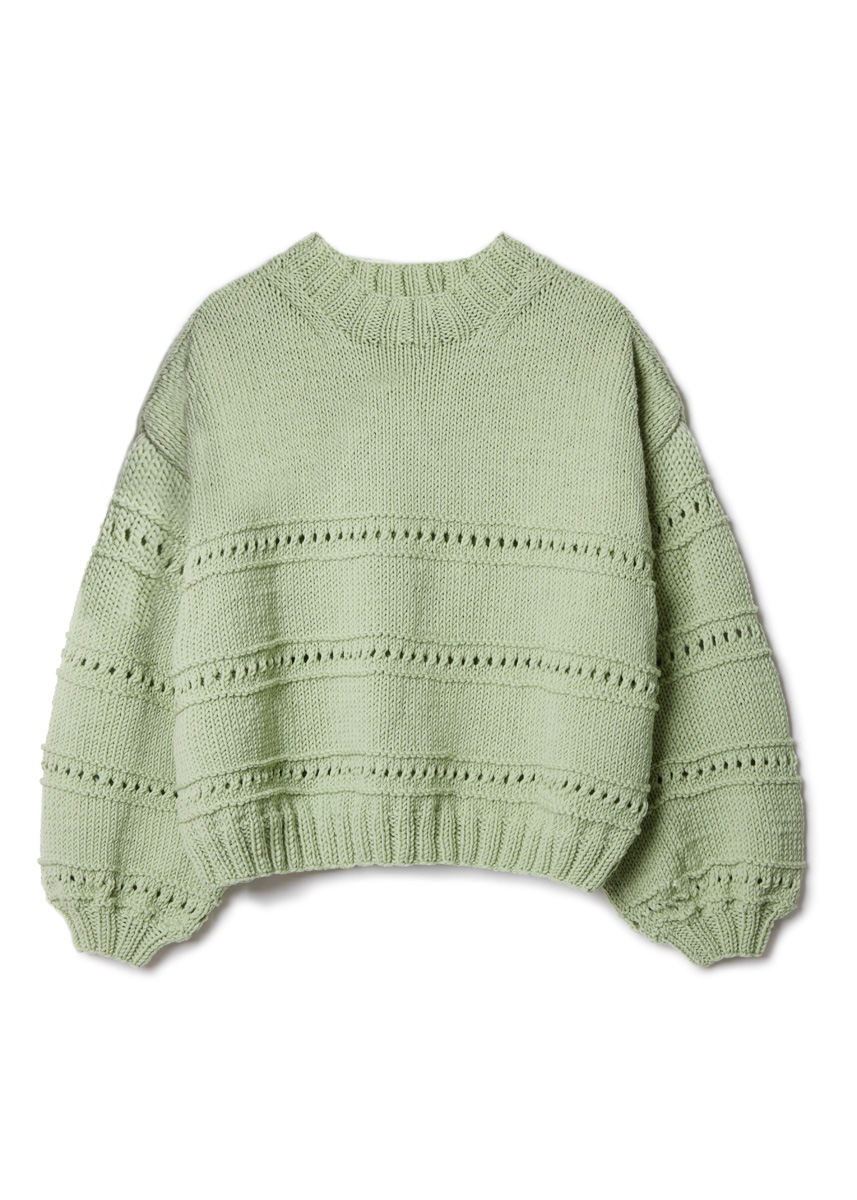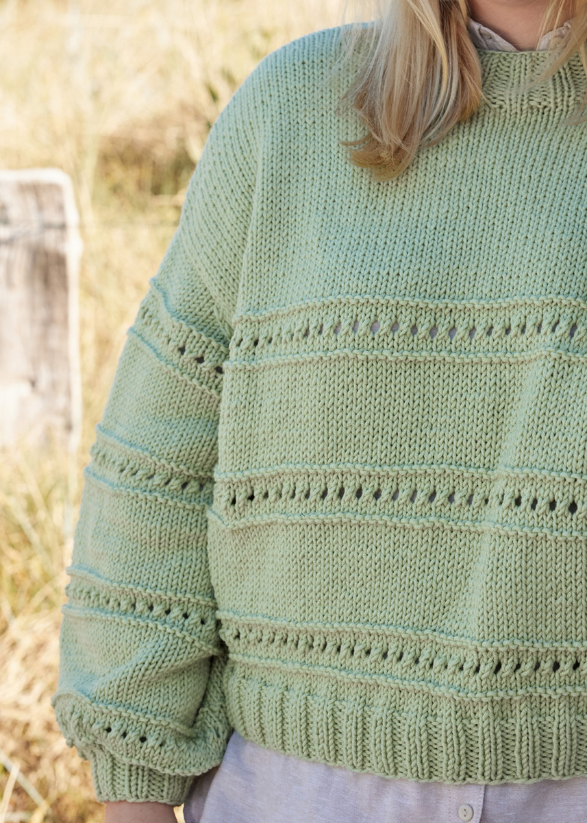 Lana Grossa Cool Wool Superbig (100% ren ny ull (merino), LL = ca. 80 m/50 g), 600 (650 – 700 – 750 – 800) g blek grønn (frg 27) Pinner: Nr. 5,5 og nr. 6, fem strømpepinner nr. 5,5