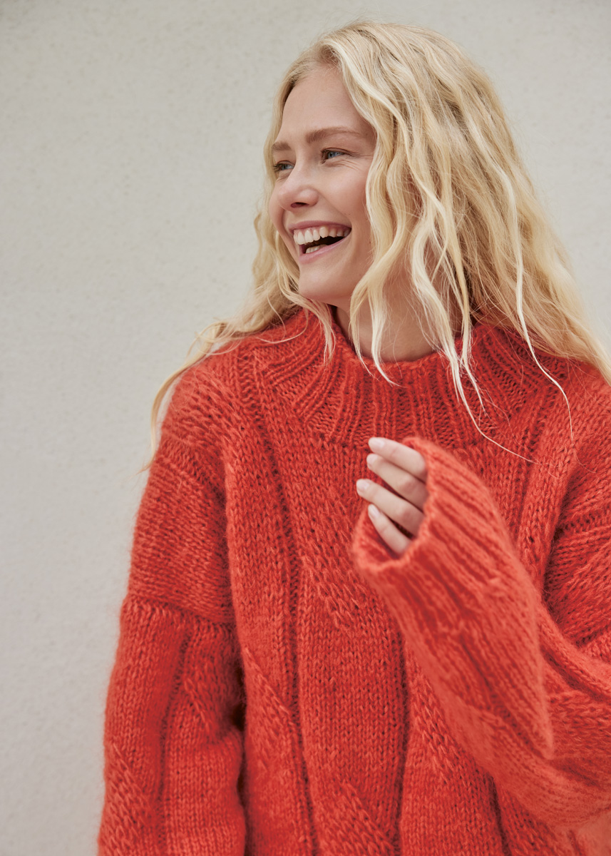 Garn: Lana Grossa Mohair di Gio (55 % mohair (superkid), 45 % ren ny ull (merino superfine), LL = 85 m / 50 g): 550 (600 / 650 / 700) g oransjerød (frg 6). Pinner: Rundpinne 5 og 7 mm, 80–100 cm lang.
