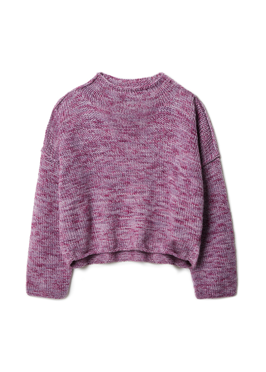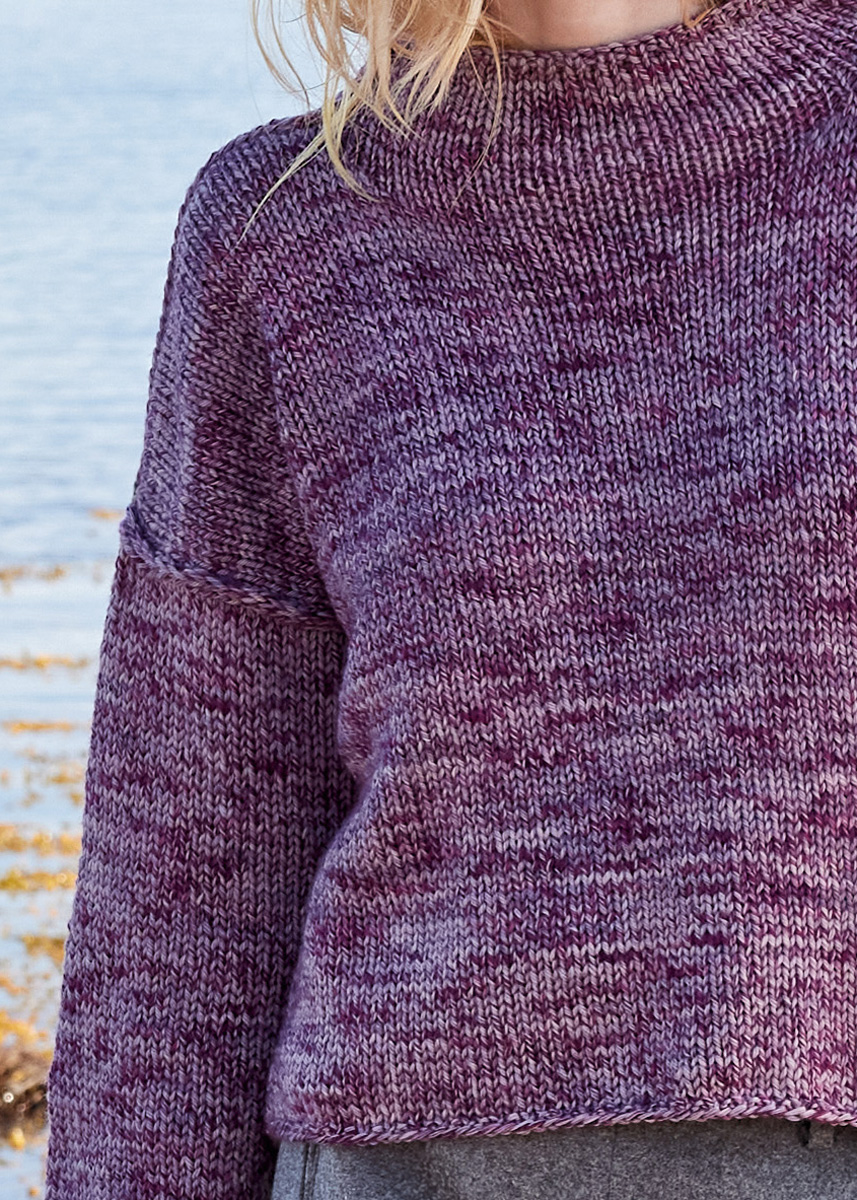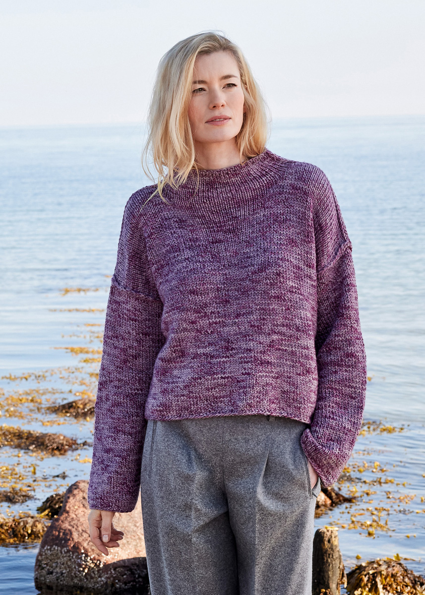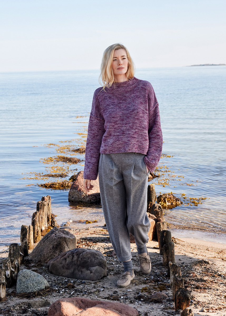 Material: Lana Grossa Vintage Chunky (100% ren ny ull (merino), LL = ca 80 m/50 g), 550 (600 – 650 – 700) g gråbeige/ mauve (frg 7) Pinner: Nr. 5 og 6, rundpinne (50 cm) nr. 5 og 6, to hjelpepinner for å legge m til side