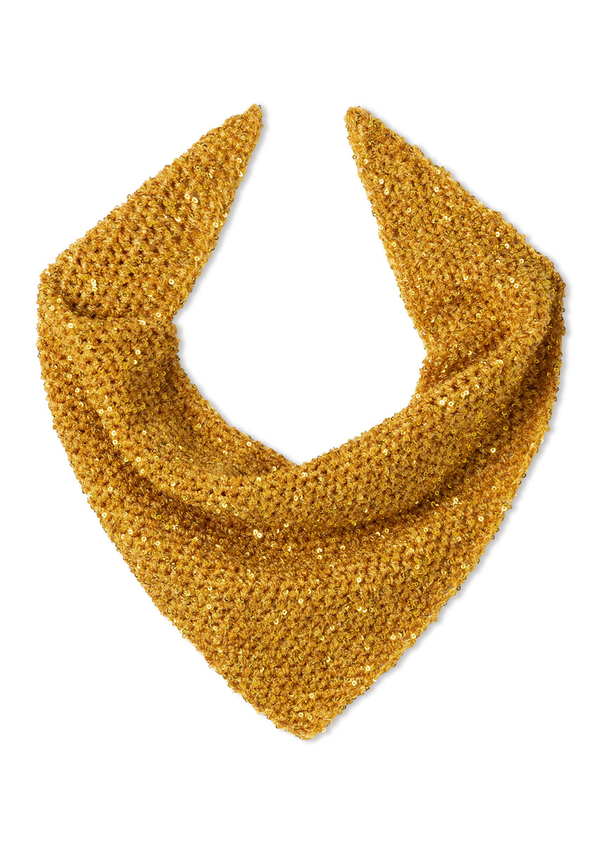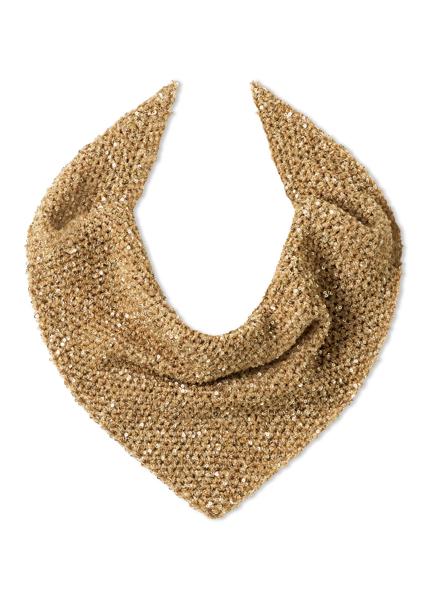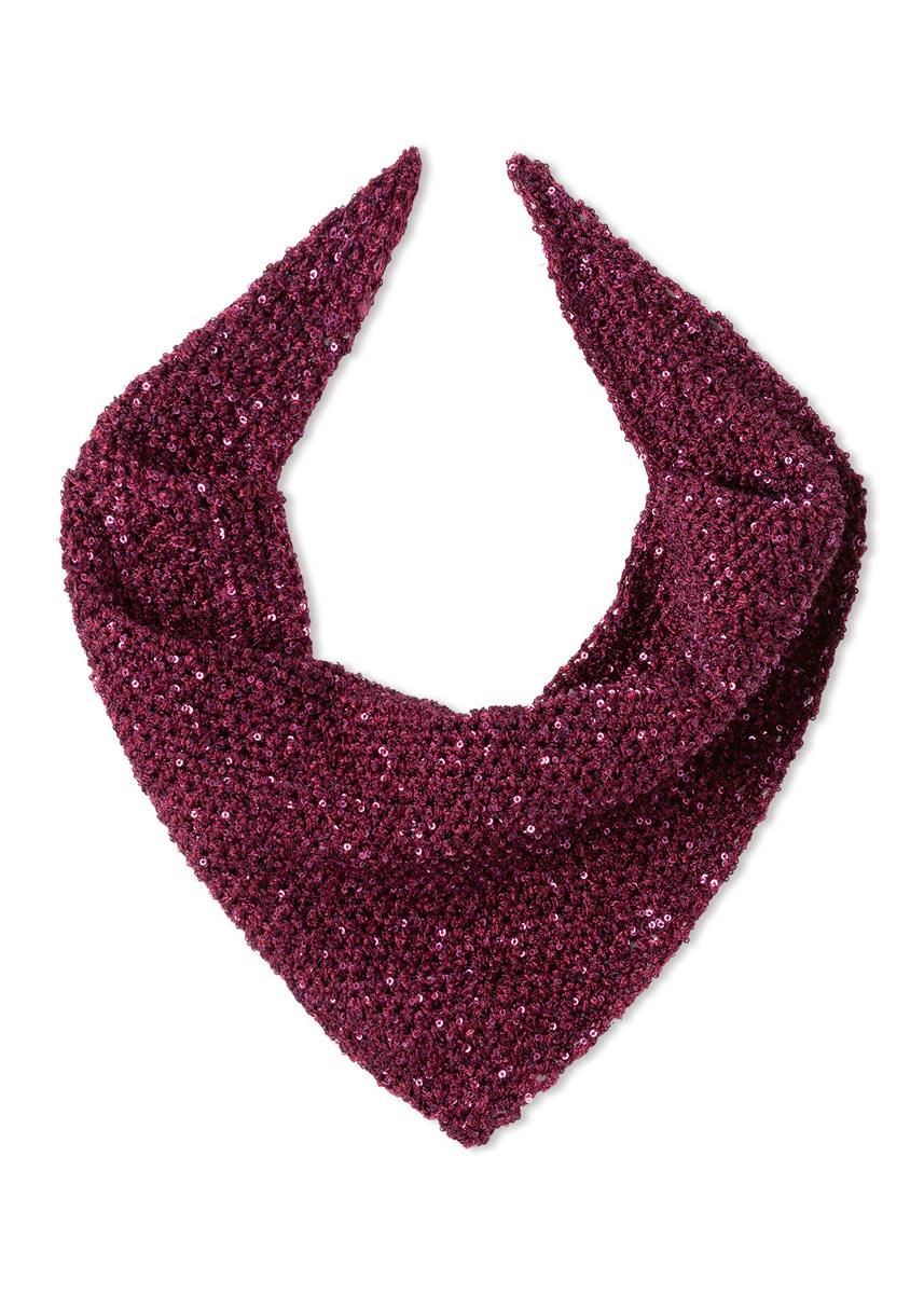 Garn: Lana Grossa «Glamour» (55 % polyamid, 45 % polyester, LL = ca. 115 m/25 g): Ca. 75 g bordeaux (frg 9) eller beige (frg 10) eller gullgul (frg 18). Heklenål: Nr. 3,5