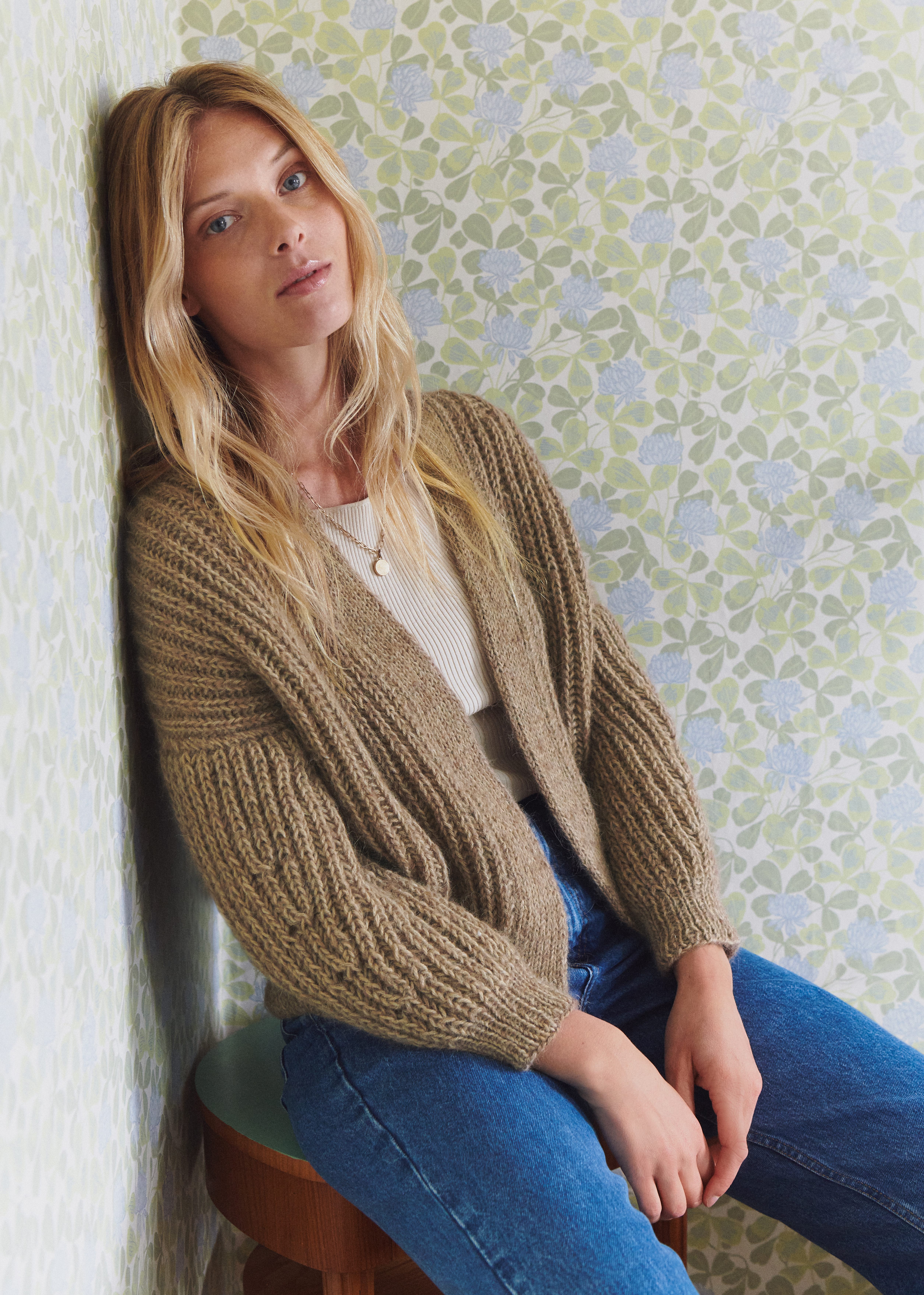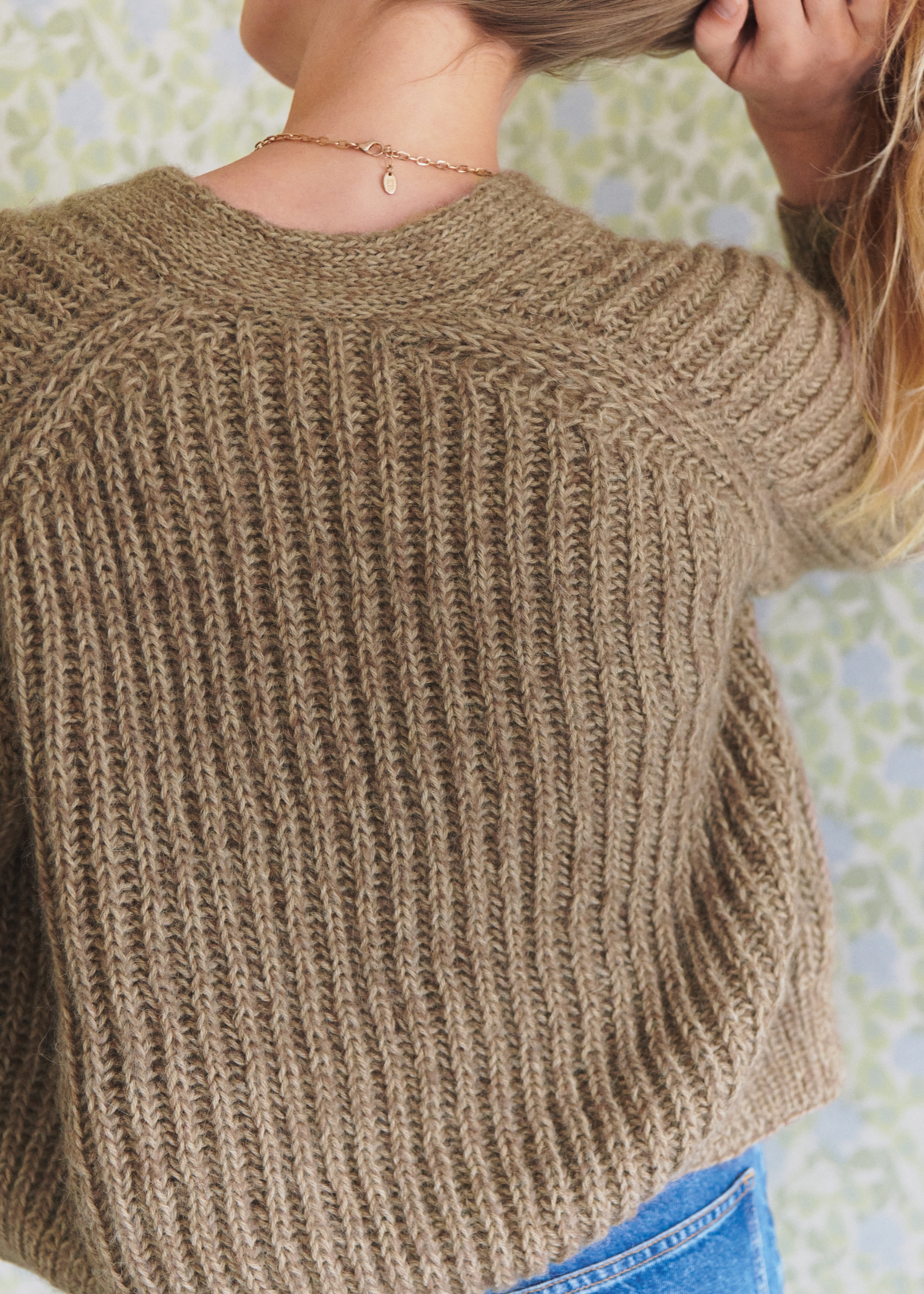 Garn: Natural Alpaca Classico fra Lana Grossa (85% alpakka (baby), 15 % ren ull (merino), LL = 125 m/50 g): 400 (450/500/550) g kamel (frg 106) og Setasuri fra Lana Grossa (69 % alpakka (suri), 31 % silke, LL = 212 m/25 g): 125 (150/175/200) g nougat (frg 4) Pinner: Rundp (40 og 100 cm) 6 og 5 mm, strømpep 5 mm Tilbehør: Maskemarkør (MM) NB: Strikk med to tråder, en tråd av hver kvalitet.